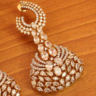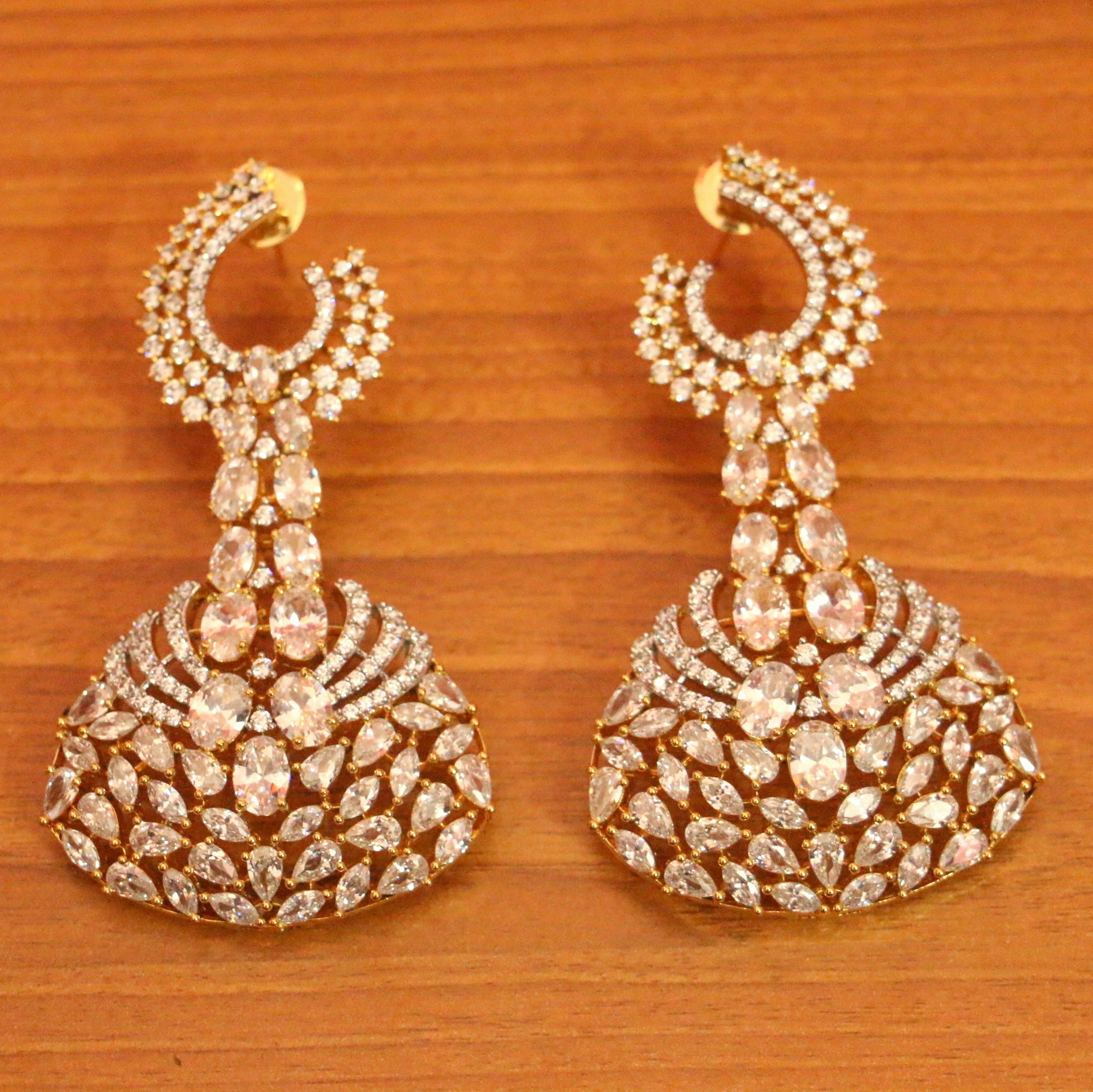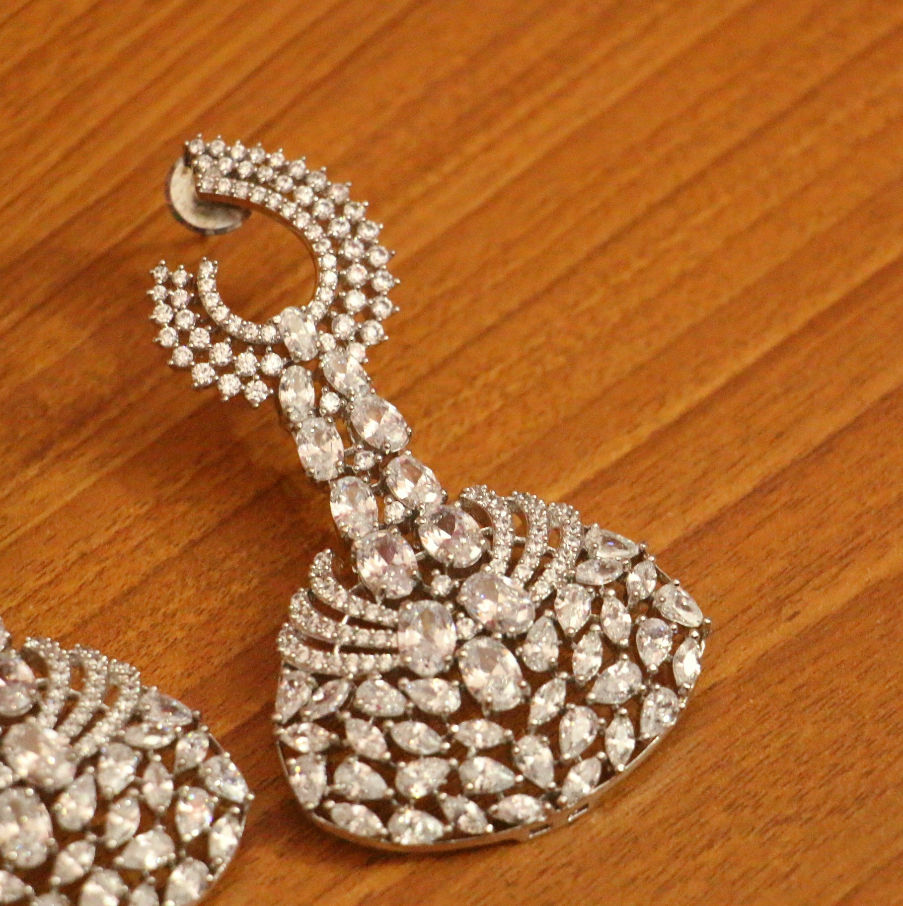 These earrings are handcrafted in silver alloy with imitation american diamond work of very fine quality. These artistic yet modern earrings are plated with high quality 18kt gold rhodium. The earrings are very light in weight.