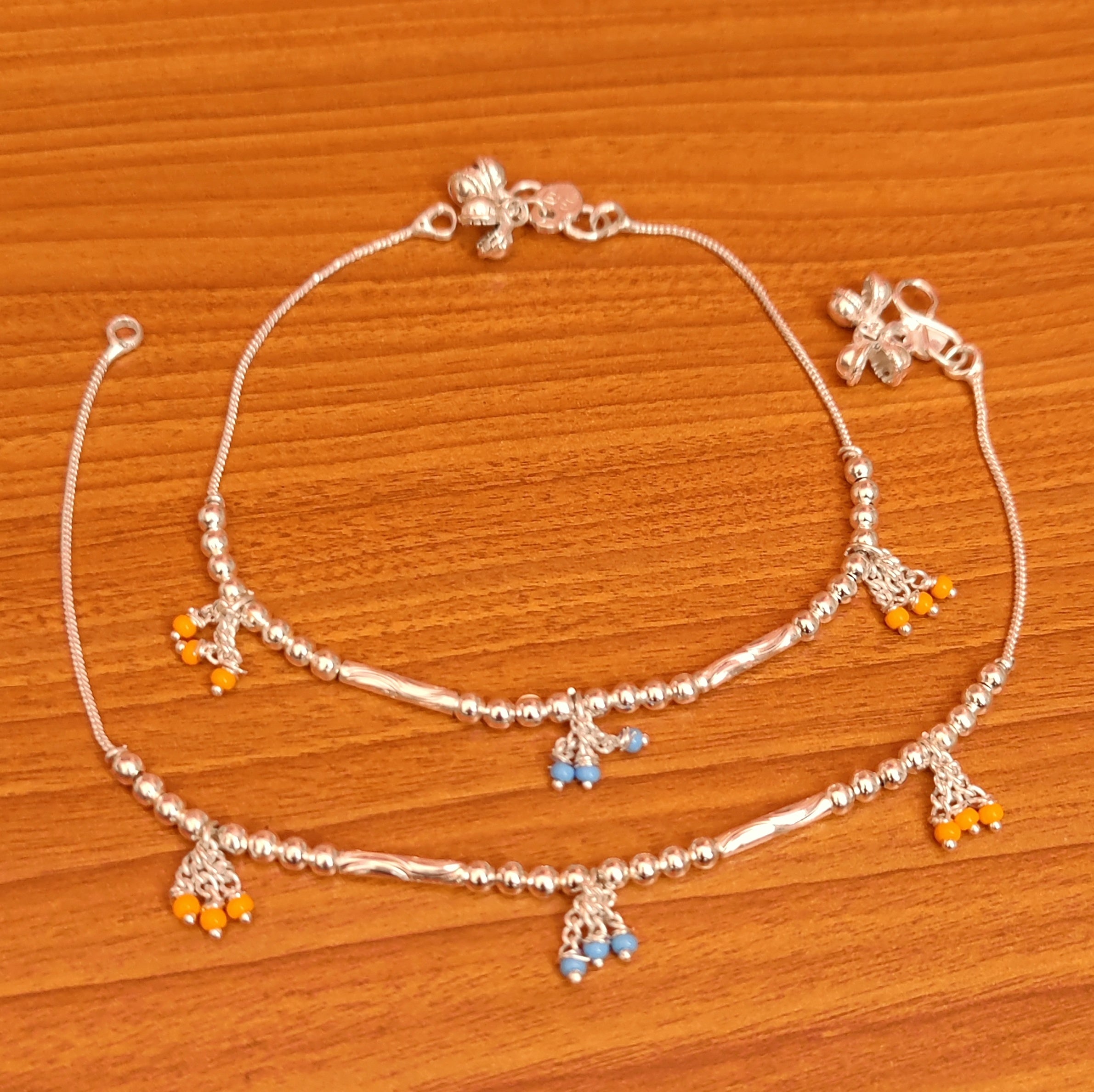 These light weight chain anklets are handcrafted in metal alloy with silver multi colour beads , the anklets are very light in weight and are plated with silver polish which gives them a real silver look.