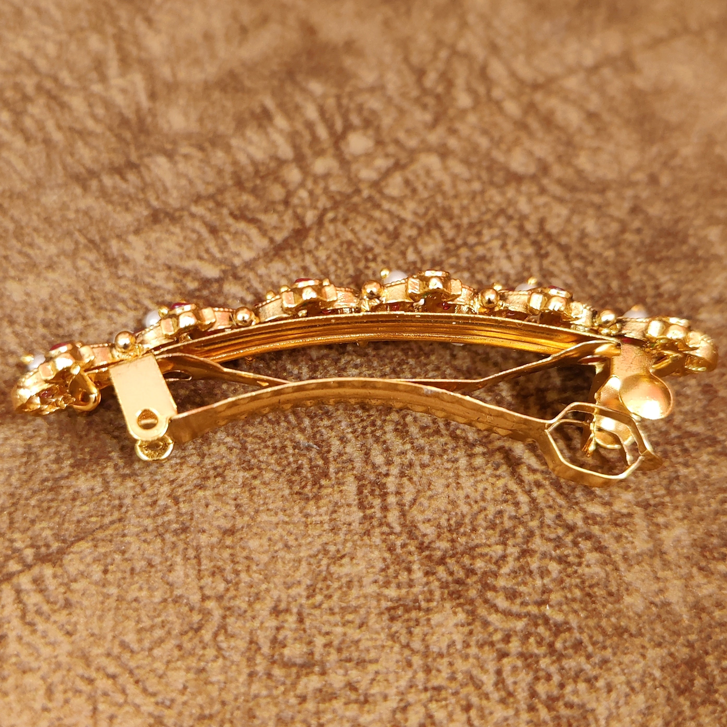 Add a regal touch to your hairstyle with the Ruby & Emerald Antique Gold Plated Pearl Hairclip. This exquisitely designed hair accessory features stunning ruby and emerald-colored stones, set in an antique gold-plated finish for a vintage charm. Delicate pearls enhance its elegance, making it a perfect choice for weddings, festive occasions, or traditional ensembles.