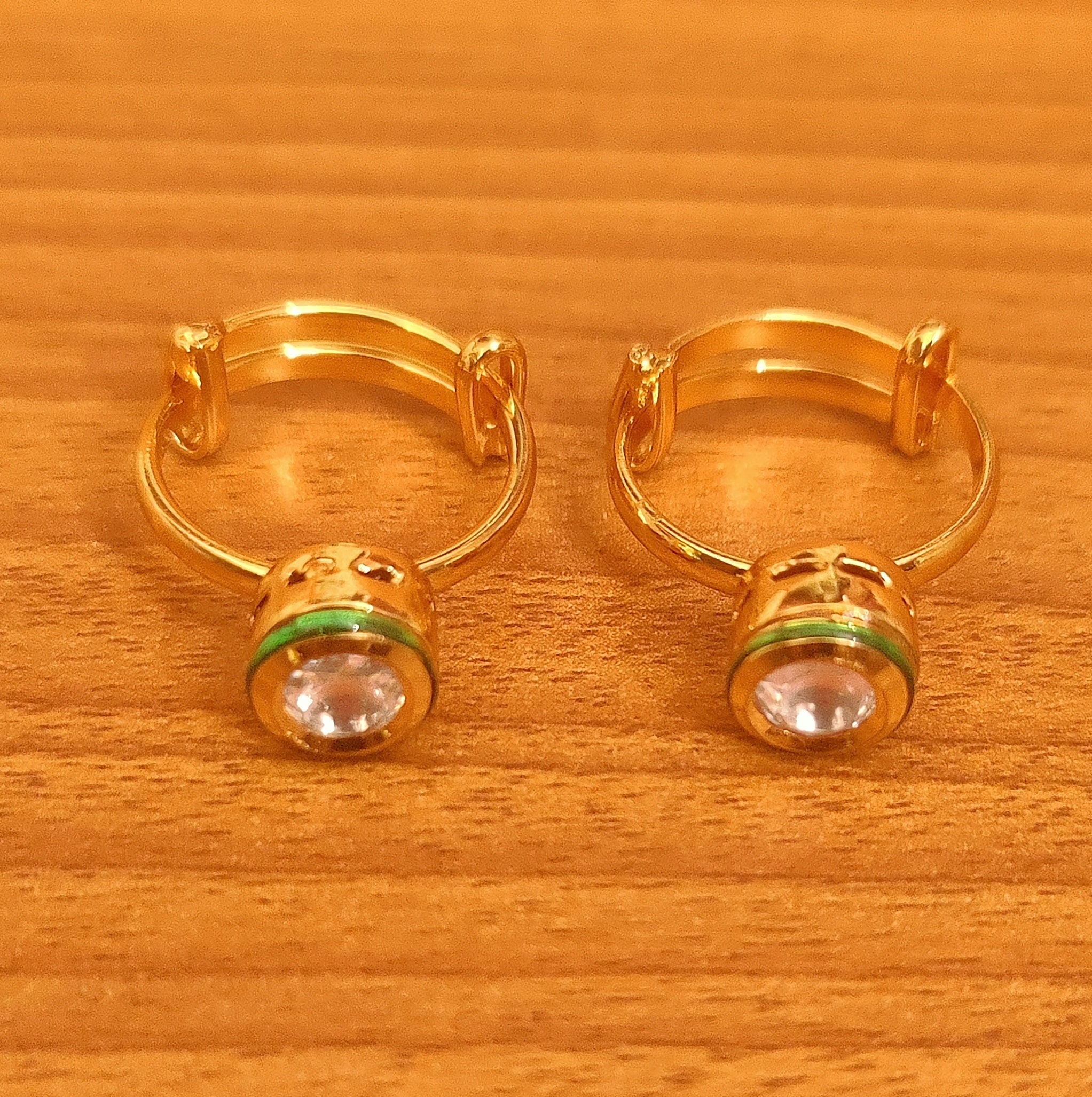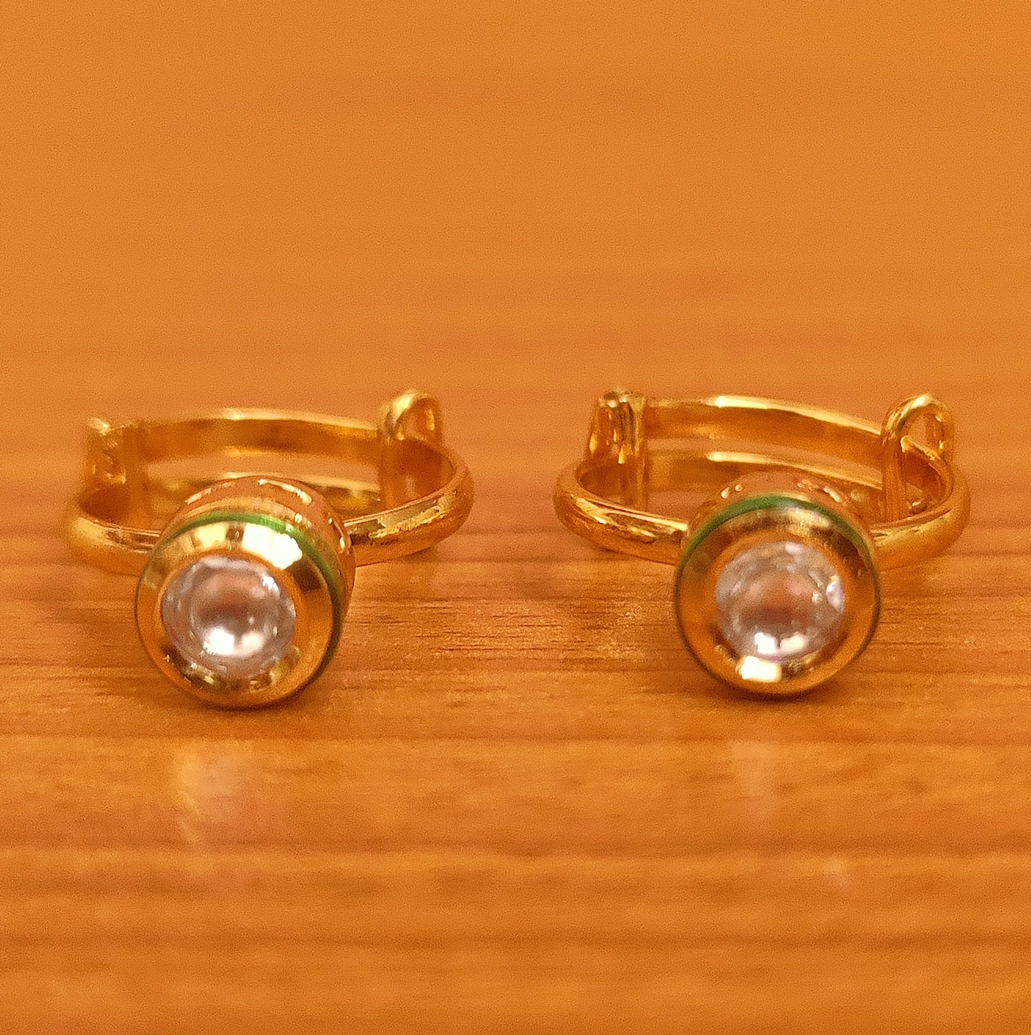 This beautiful toering is handcrafted in brass alloy with imitation cz stone and kundan work of very fine quality , this toering is coated with 18 kt nickle free gold plating to avoid skin allergies and its very light in weight .