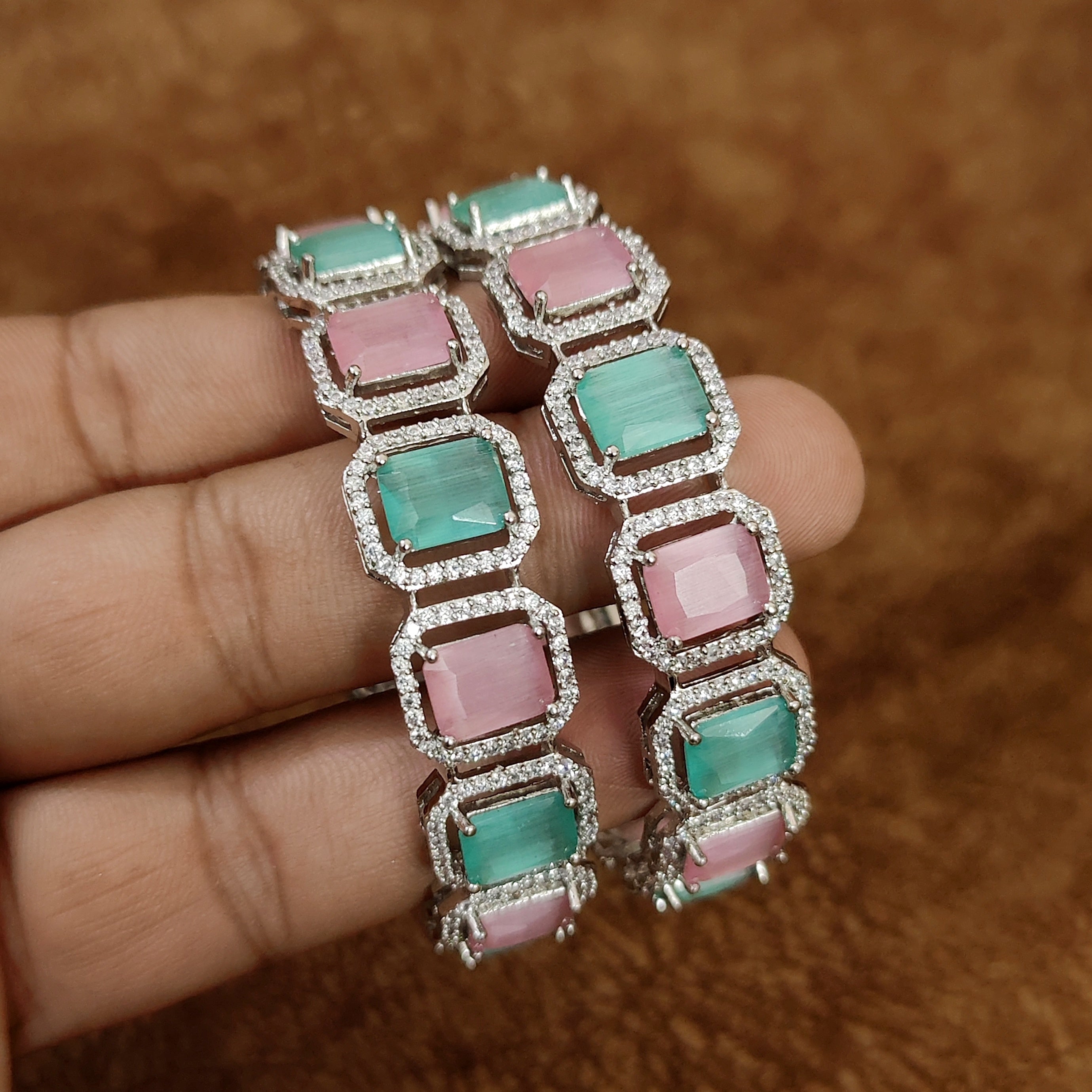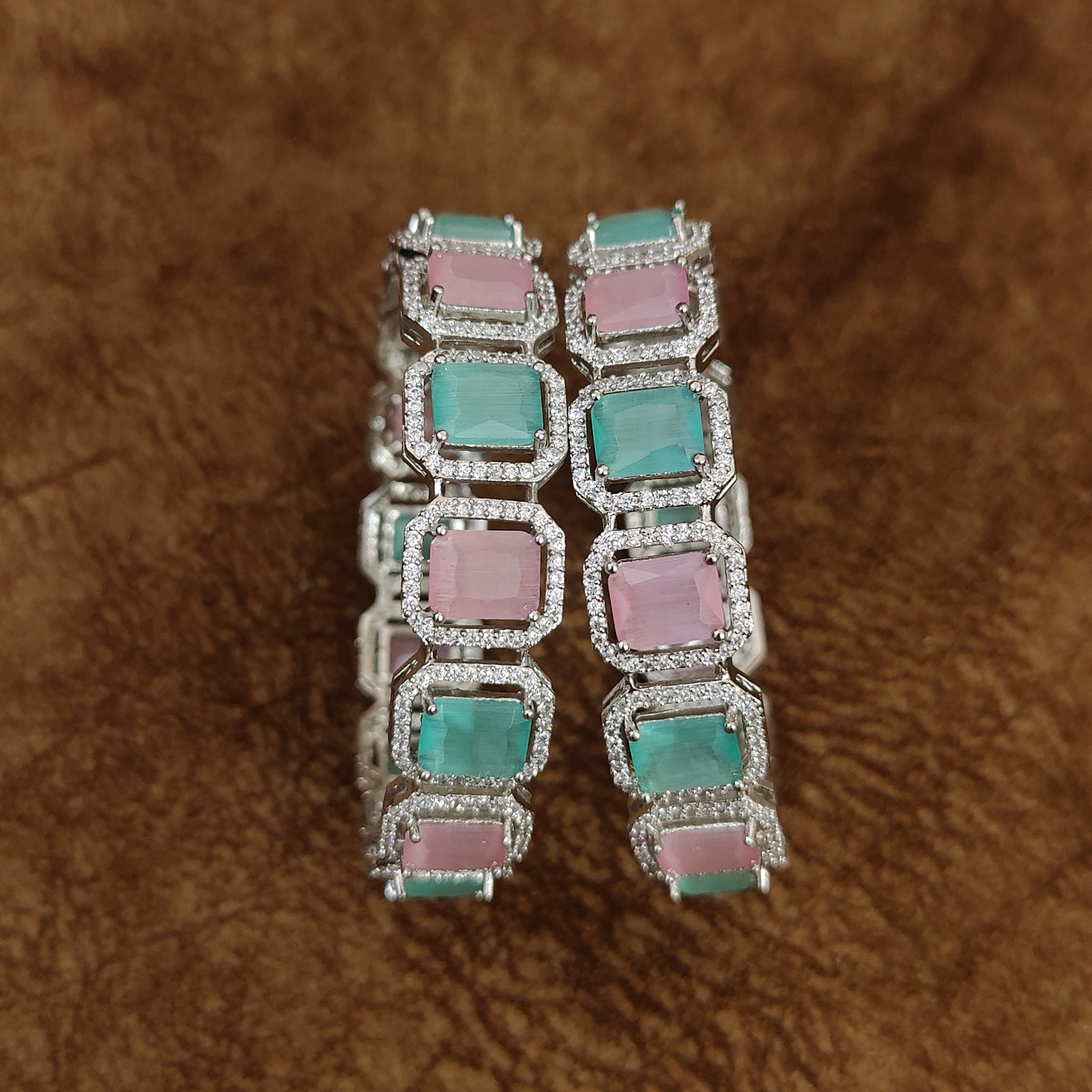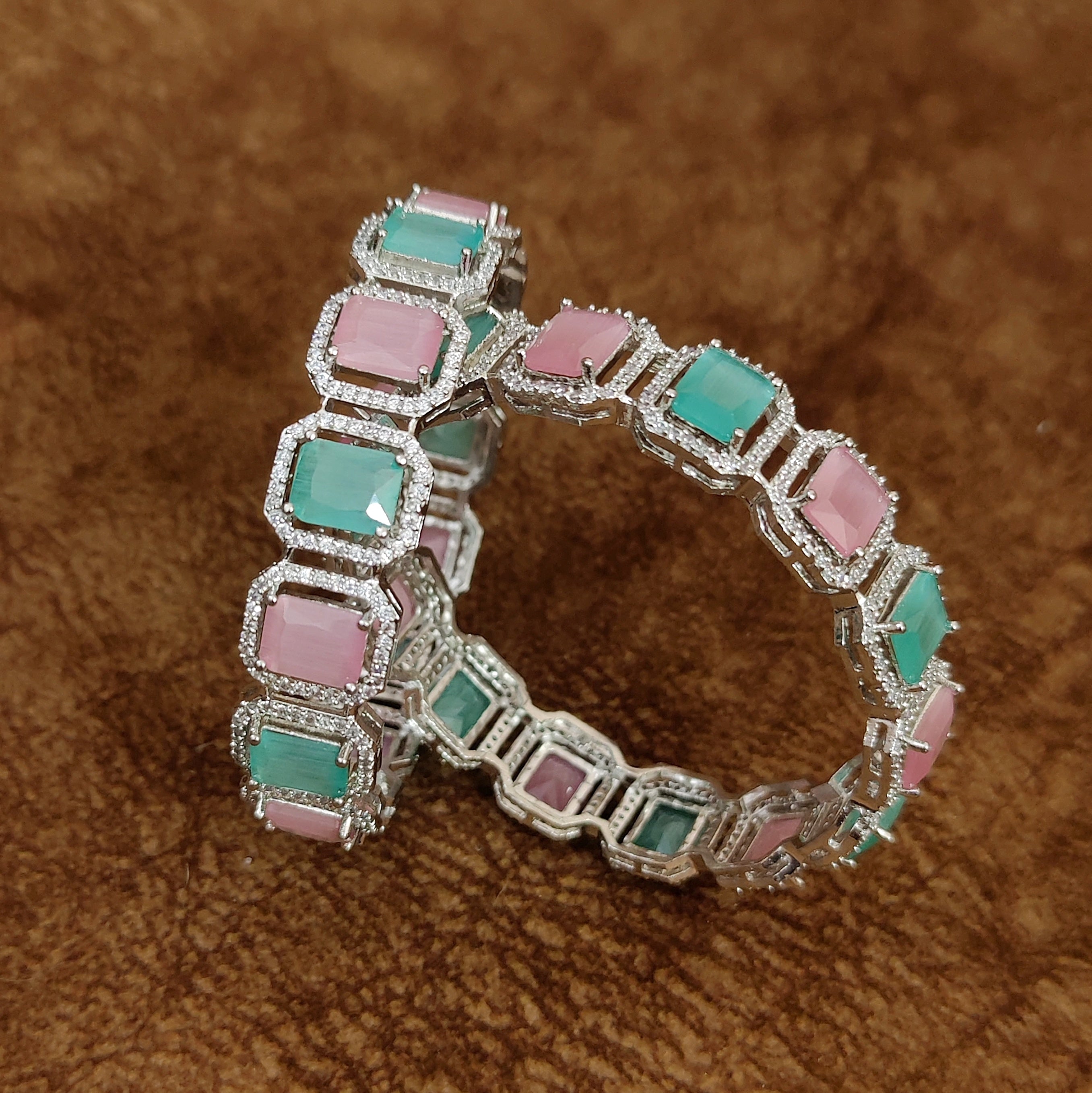 Embrace elegance with the Pink Mint Colour Silver-Plated Exclusive Bangles, a perfect blend of sophistication and charm. These exquisite bangles feature a delicate combination of pink and mint stones set against a radiant silver-plated finish. Ideal for weddings, festive occasions, and celebrations, these bangles pair beautifully with ethnic and modern outfits, adding a touch of glamour to your ensemble.