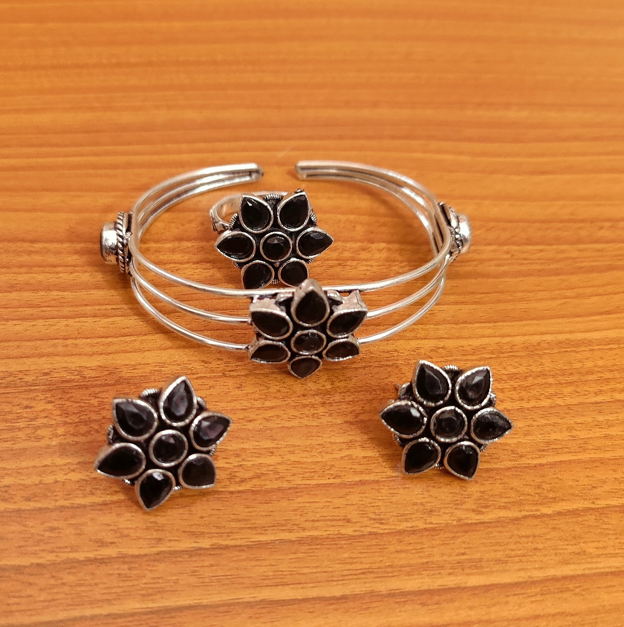 BLACK COLOUR GERMAN SILVER BRACELET EARRINGS & RING SET
