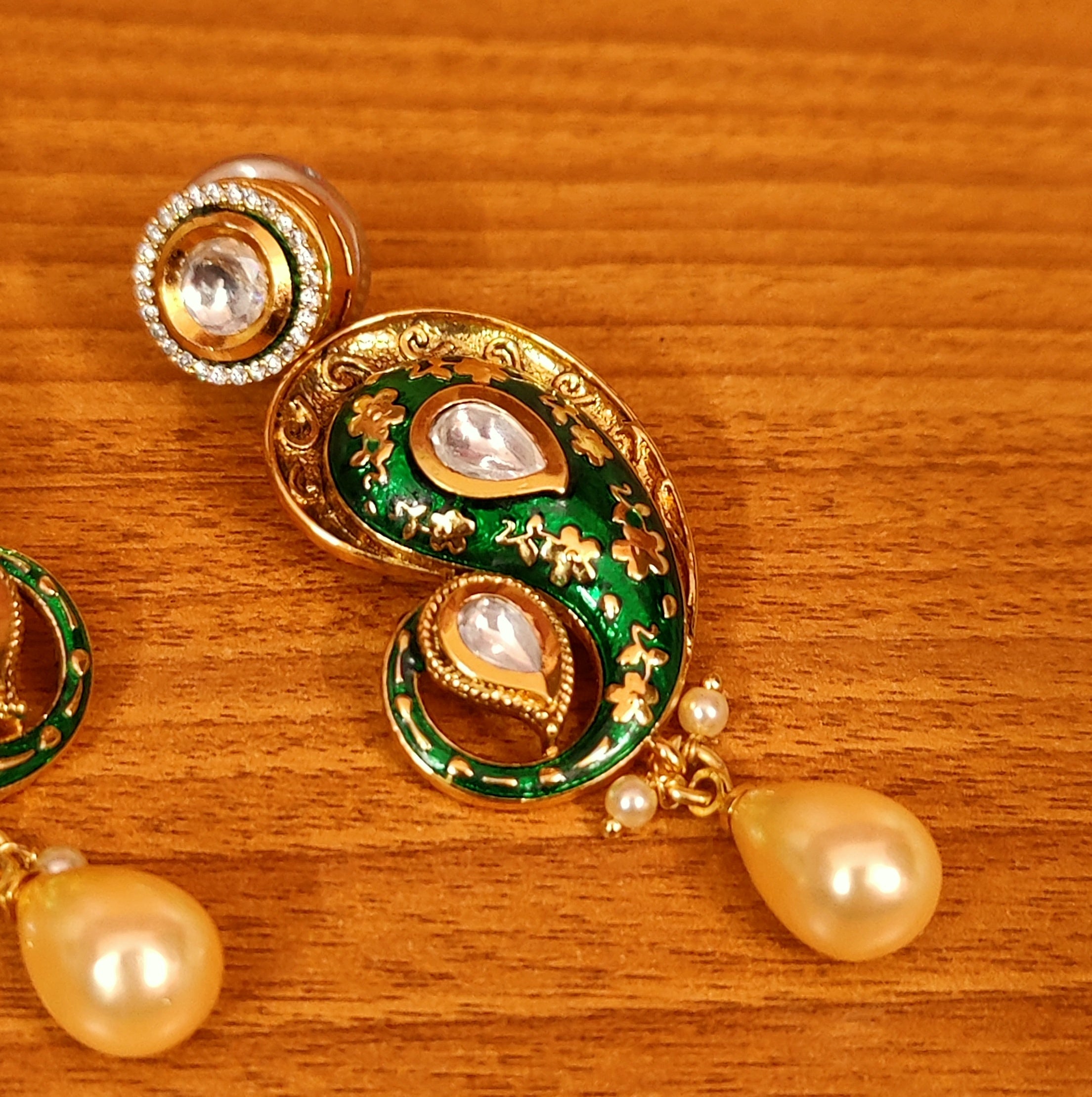 Kundan Meenakari Leaf Pattern Uncut Pearl Earrings
