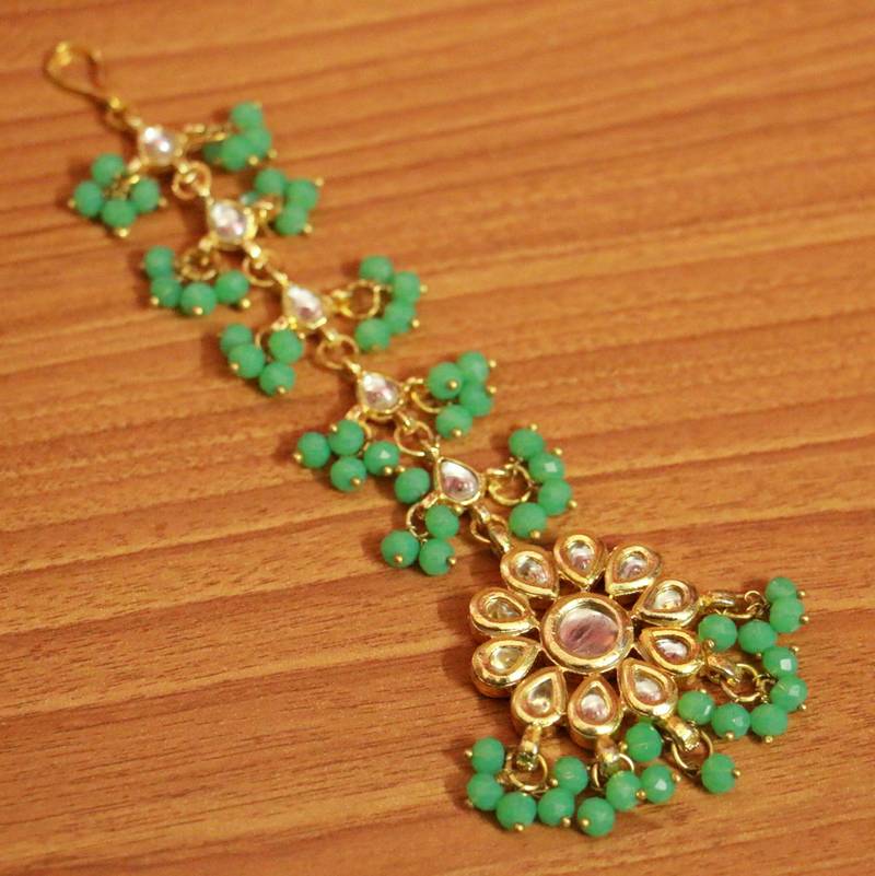Green Crystal Kundan Meenakari Tikka With Earrings
