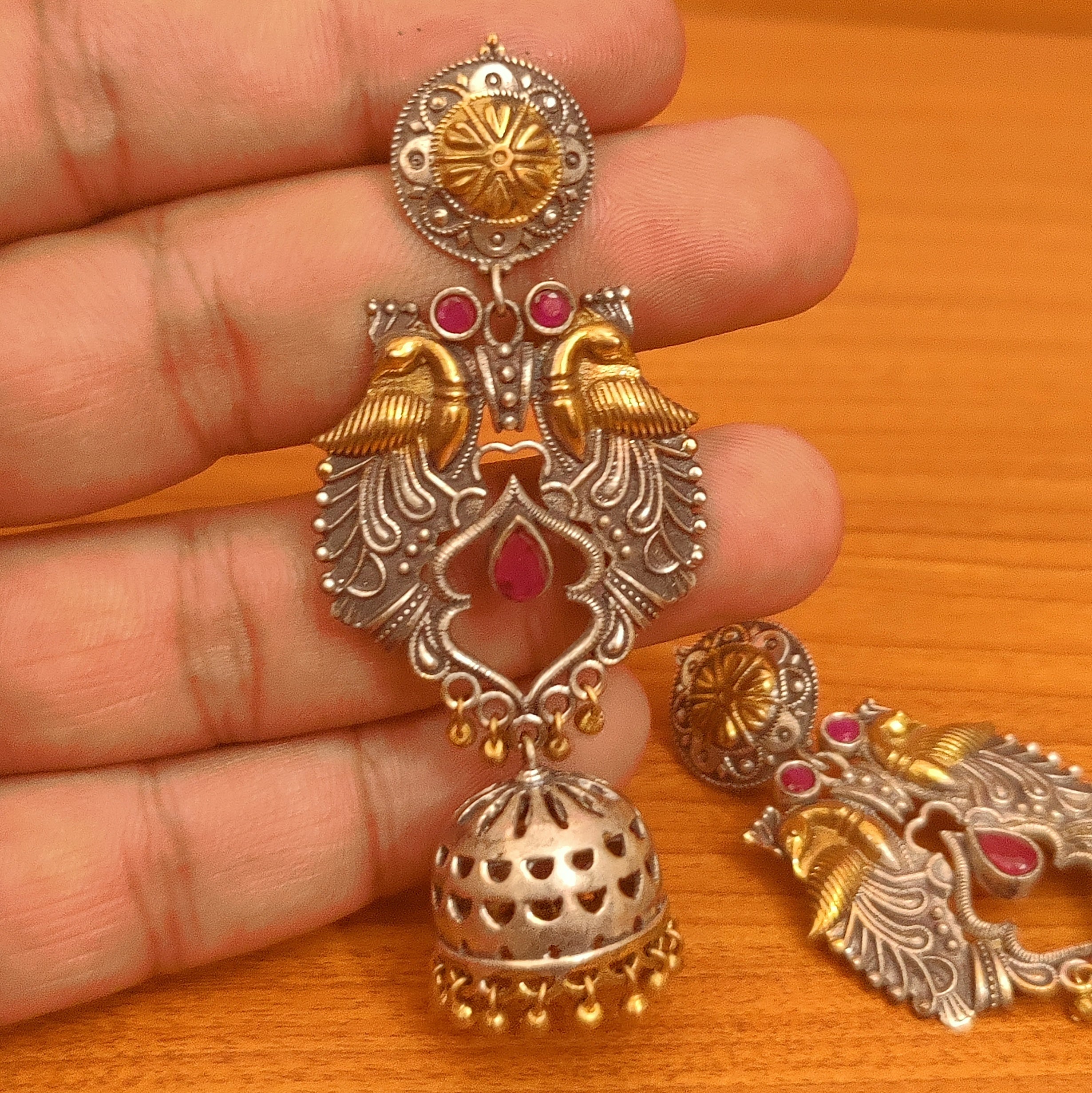 These beautiful peacock pattern jhumkas are handcrafted in metal alloy . these earrings are coated with red colour stone & oxidised silver polish which give them a unique look an absolutely stunning piece to own and are very light in weight.