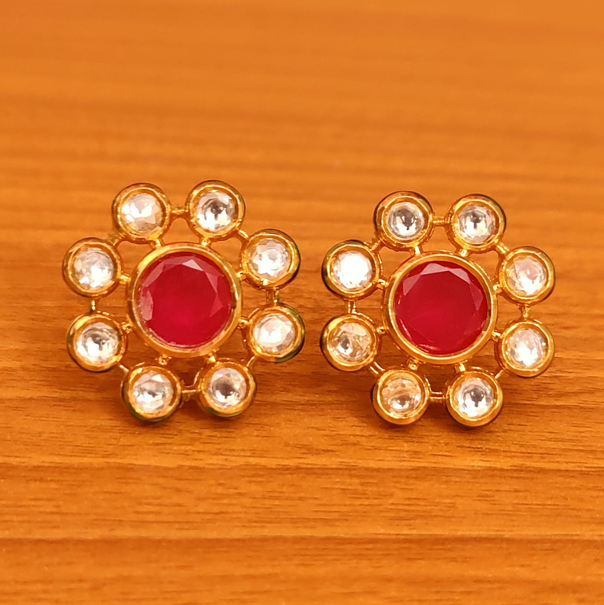 These beautiful studs are handcrafted in brass alloy with imitation red colour stone & kundan work of very fine quality. these artistic yet modern earrings are plated with high quality gold rhodium. the earrings are very light in weight.