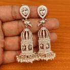 These beautiful cage pattern jhumkas are handcrafted in brass alloy with imitation cz stone & semi precious pearls of very fine quality. these artistic yet modern earrings are plated with high quality white gold rhodium. the earrings are very light in weight.