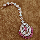The sleek floral chain design complements the luxurious pendant, giving it a refined and contemporary appeal. Perfect for bridal wear, receptions, cocktail parties, weddings, and festive occasions, this Maang Tikka offers a high-end diamond-like finish at an affordable price.
