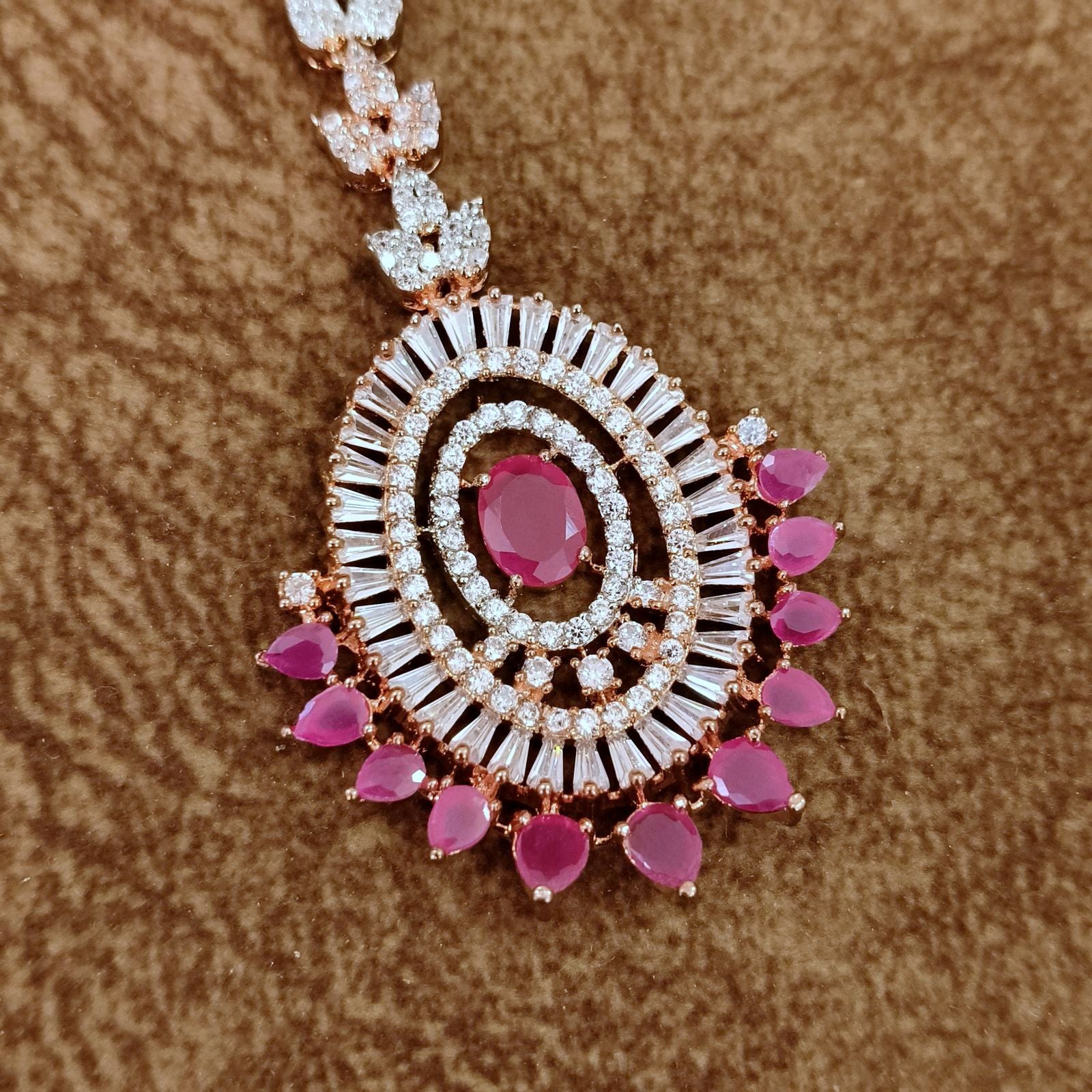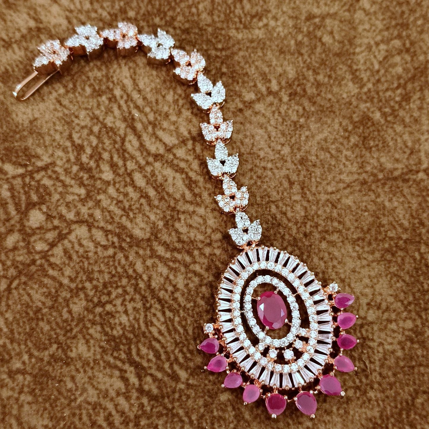 Diamond Look Pink Stone Maang Tikka – CZ Bridal Head Jewelry for Wedding & Party Wear