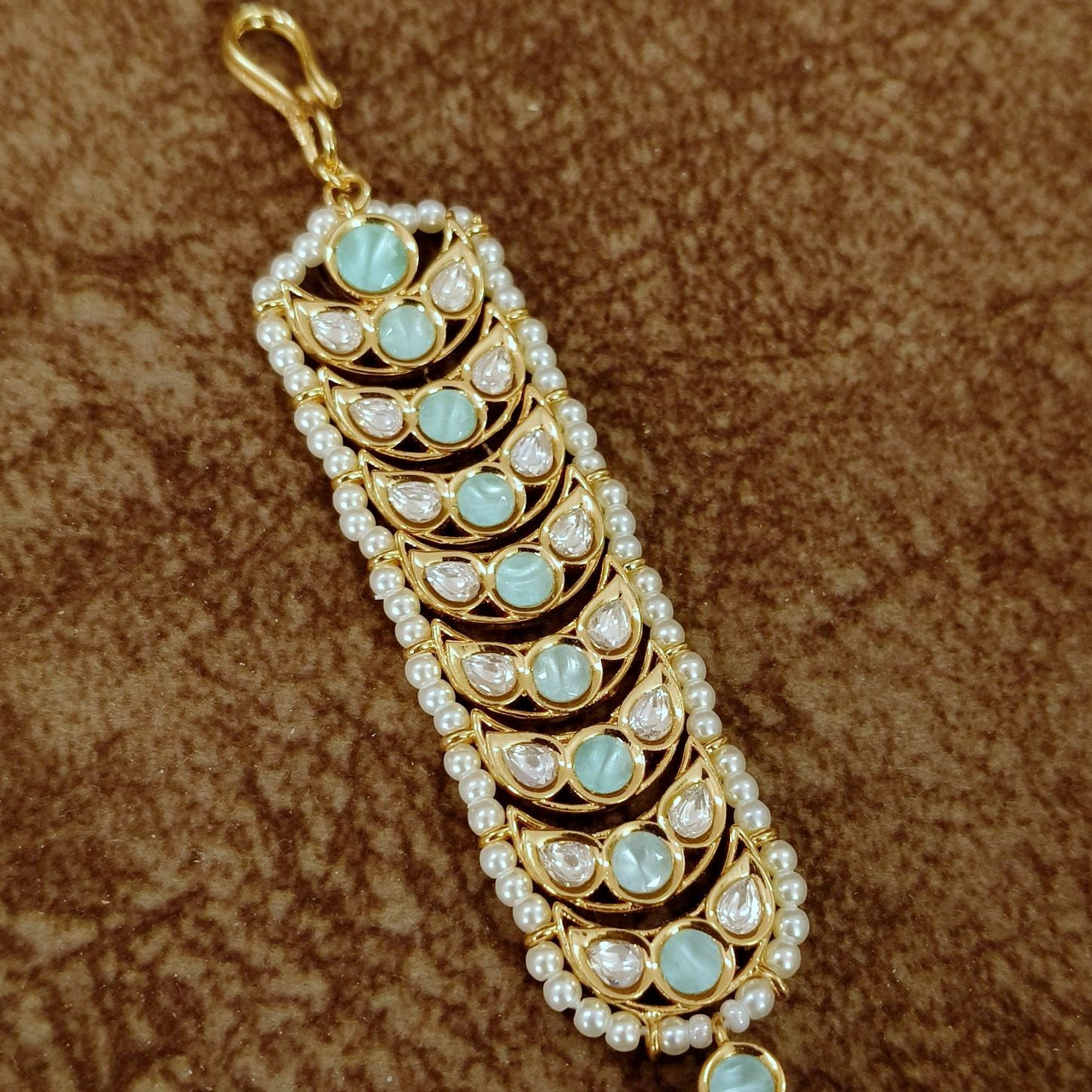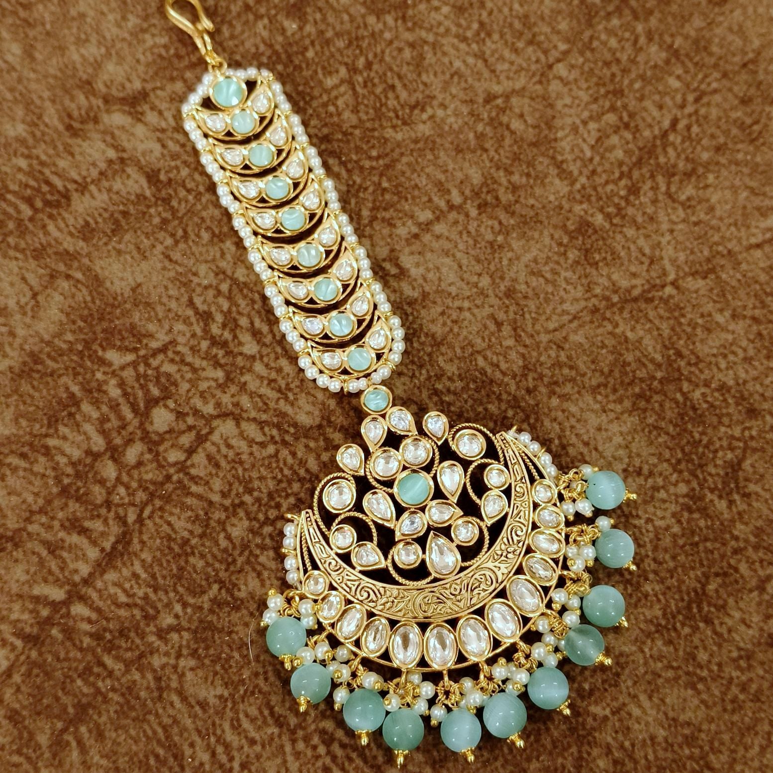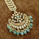 Add a refreshing touch of elegance to your bridal look with this stunning Kundan Chand Maang Tikka, beautifully designed with a soft mint green accent. Featuring a classic crescent (chand) motif adorned with premium polki-style kundan stones, this piece is elevated with delicate pearl detailing and finished with elegant mint green bead drops.