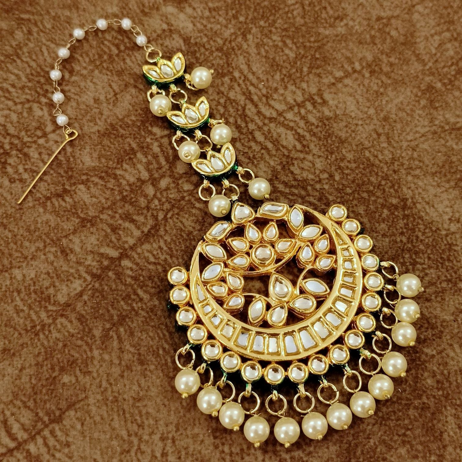 Kundan Pearl Chand Maang Tikka – Traditional Bridal Crescent Head Jewelry