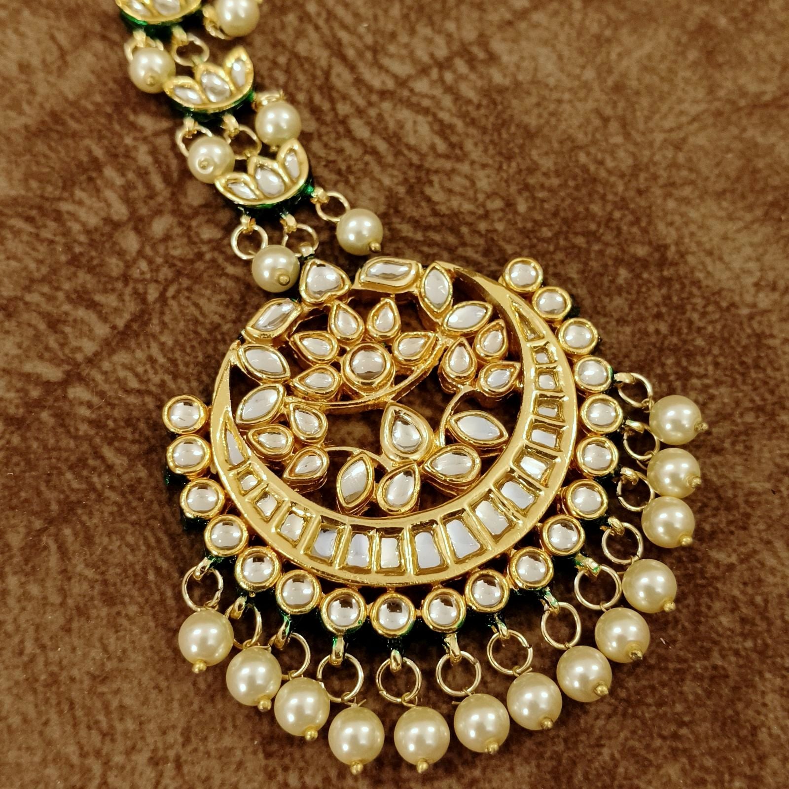 Elevate your bridal elegance with this exquisite Kundan Pearl Chand Maang Tikka, inspired by timeless Mughal artistry. Designed in a graceful crescent (chand) shape, this piece features finely set kundan stones with intricate detailing, beautifully complemented by delicate pearl drops that add a soft, luxurious finish.