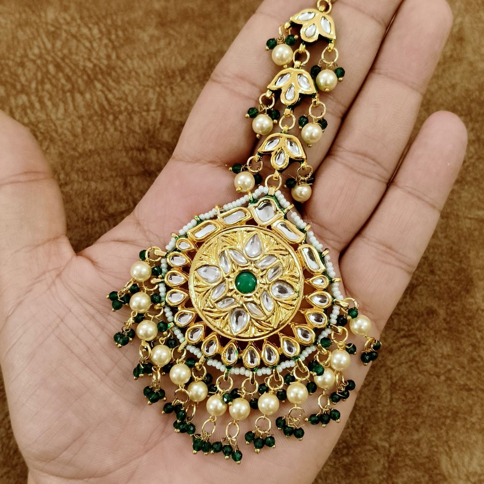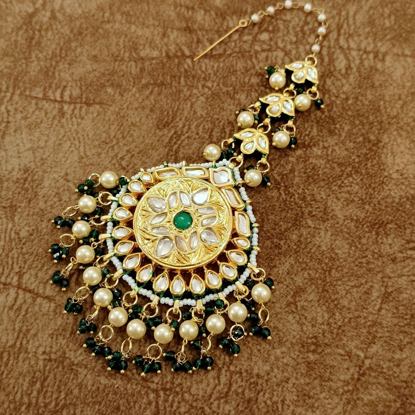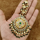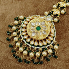Kundan Pearl Maang Tikka with Green Stone – Bridal Traditional Head Jewelry