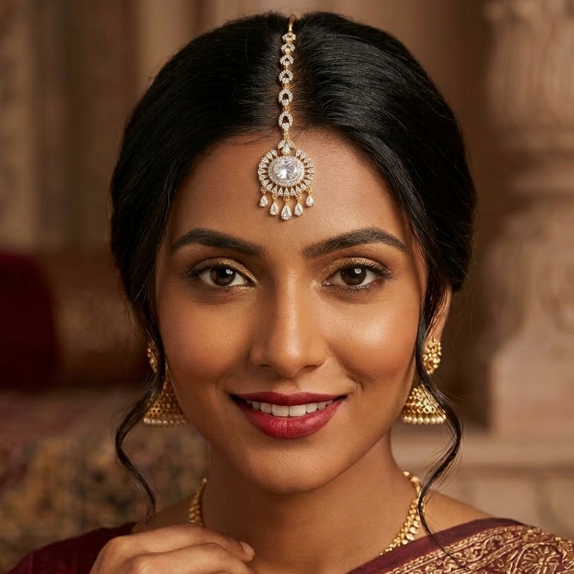 Perfect for Indian weddings, bridal wear, engagement ceremonies, festivals, and party occasions, this Maang Tikka offers a premium diamond-like shine while being lightweight and comfortable for long hours.