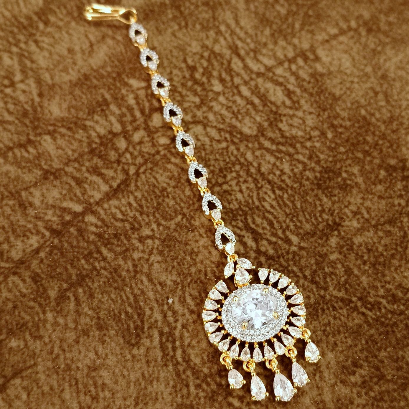 Add a royal touch to your bridal look with this luxury CZ diamond-look Maang Tikka, crafted to perfection for modern brides and festive styling. Featuring a stunning circular centerpiece with a radiant stone, surrounded by delicate teardrop accents and a beautifully detailed chain, this piece exudes elegance and grace.