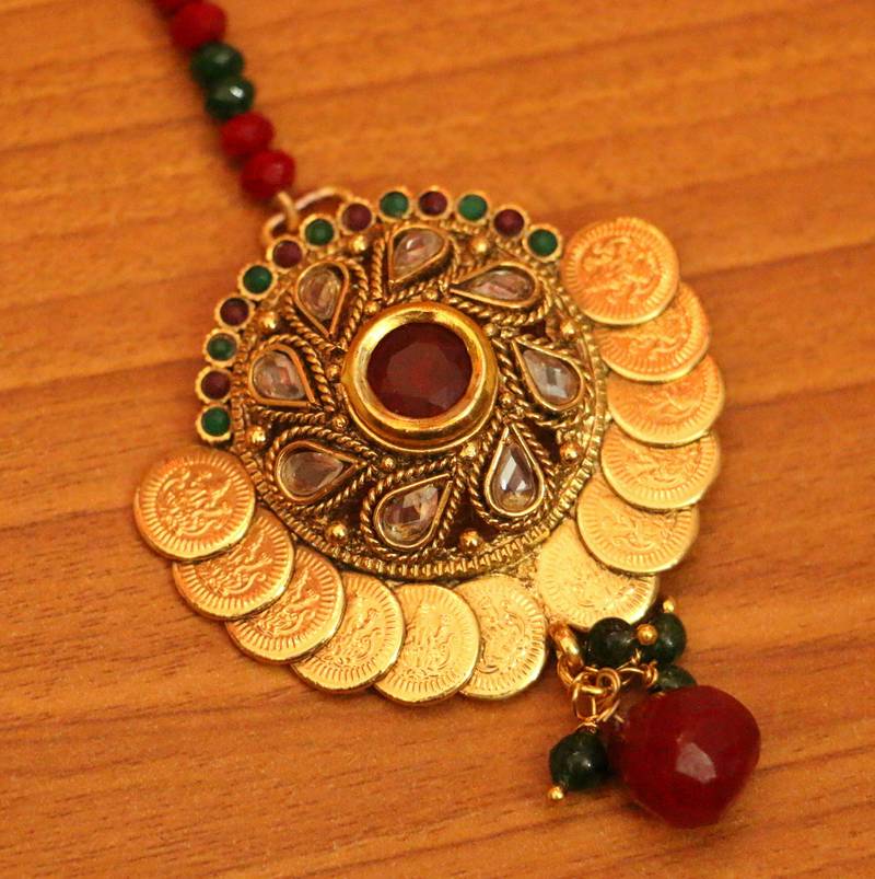 GOLD PLATED KUNDAN LOOK RED ONYX MAANG TIKKA