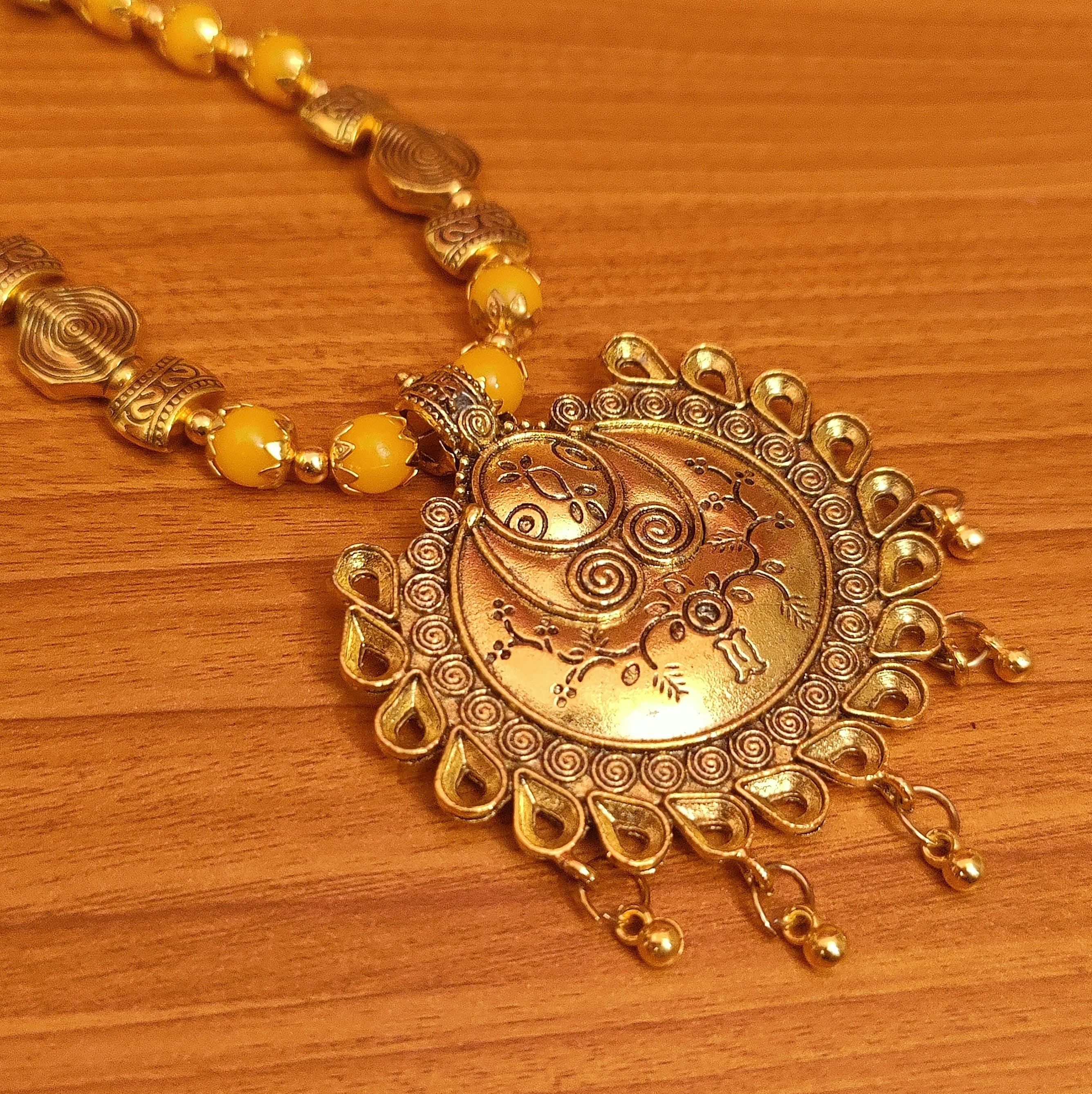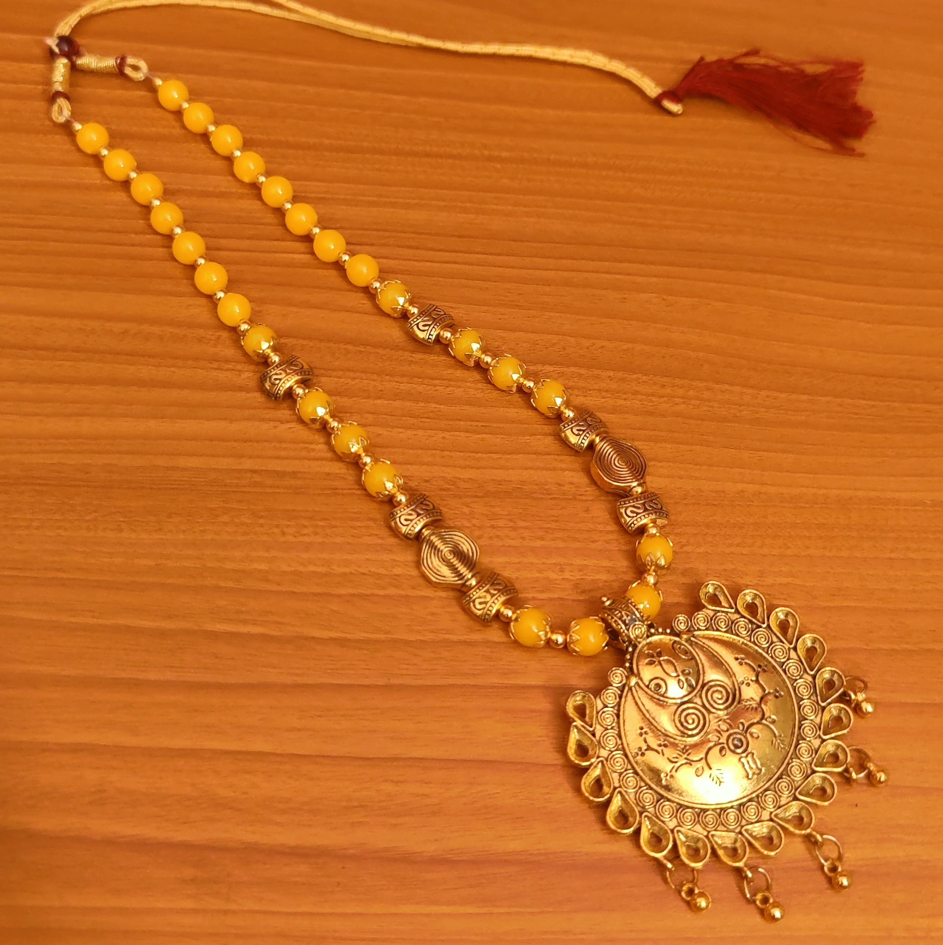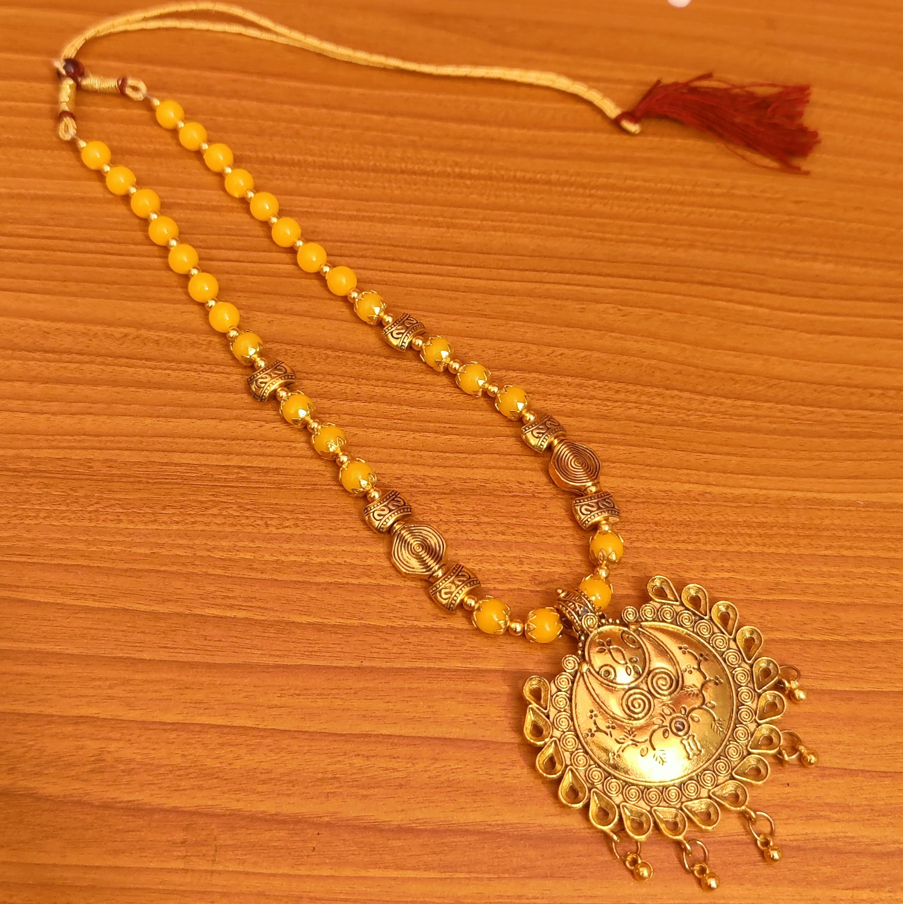 This necklace is handcrafted in yellow colour beads with brass antique motifs , the necklace is light in weight and trendy and can be worn casually.