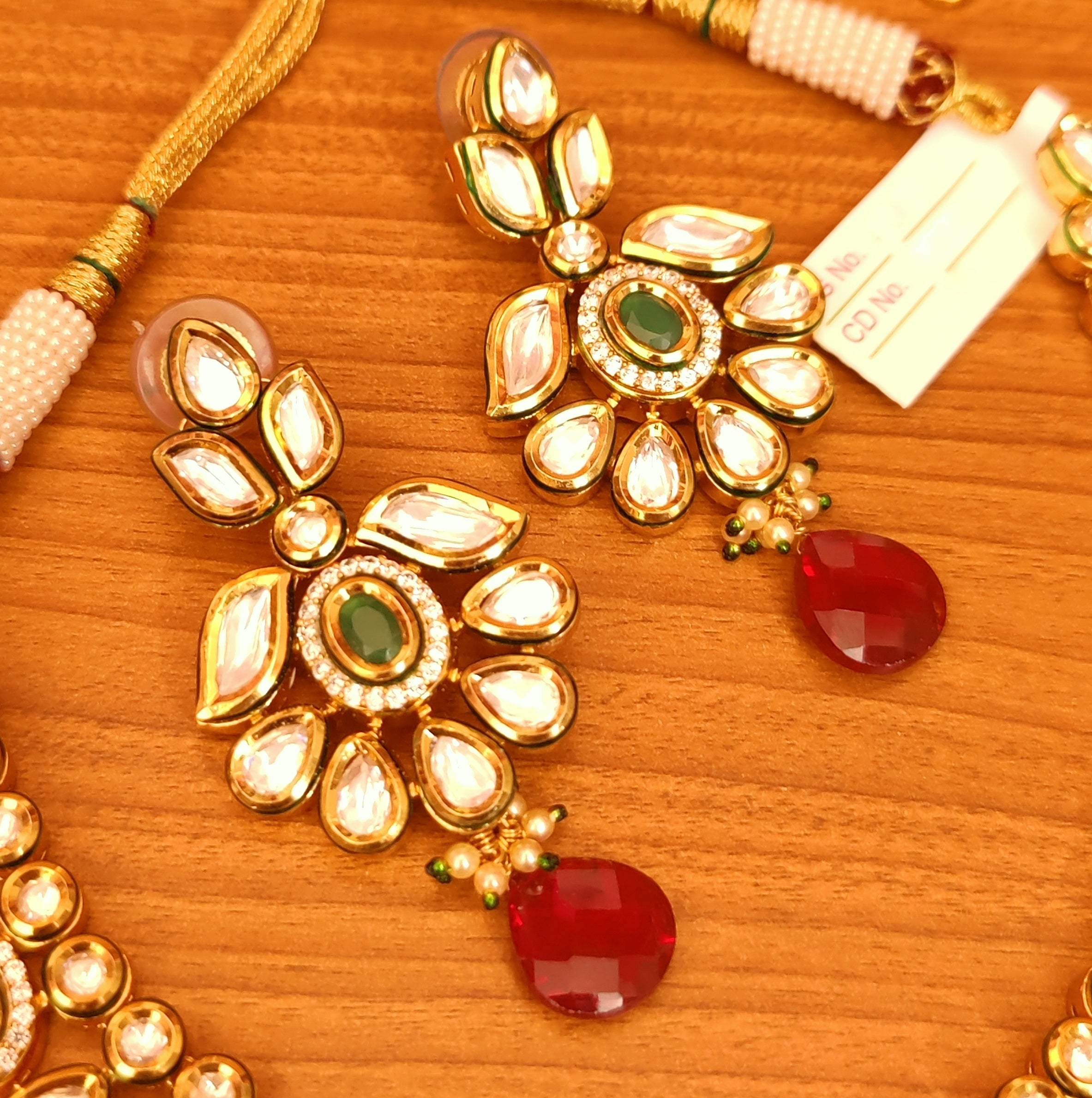 This beautiful necklace set is handcrafted in brass alloy with imitation red & green colour stone, cz stone and Kundan with meenakari work of very fine quality . this neckace set is coated with 18Kt gold polish which give them a unique look . an absolutely stunning piece to own and are very light in weight.
