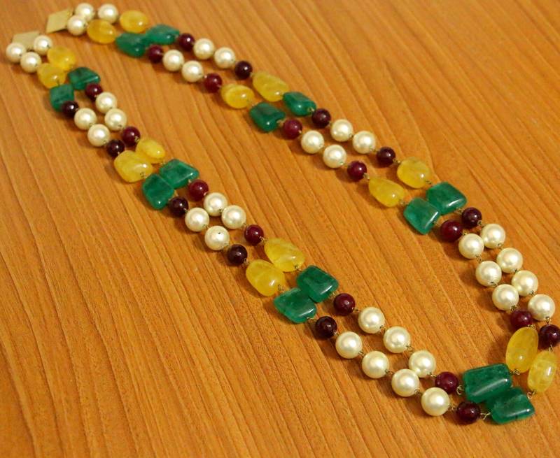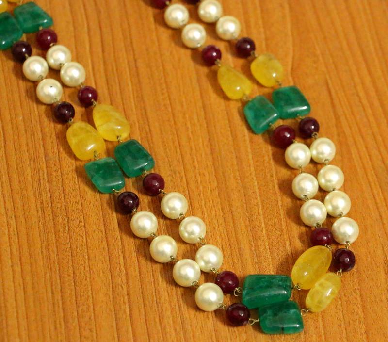 This beautiful necklace is handcrafted in brass alloy with imitation pearls & multicolor onyx beads work of very fine quality . This necklace is coated with 18 kt gold polish which give them a unique look . An absolutely stunning piece to own and are very light in weight.