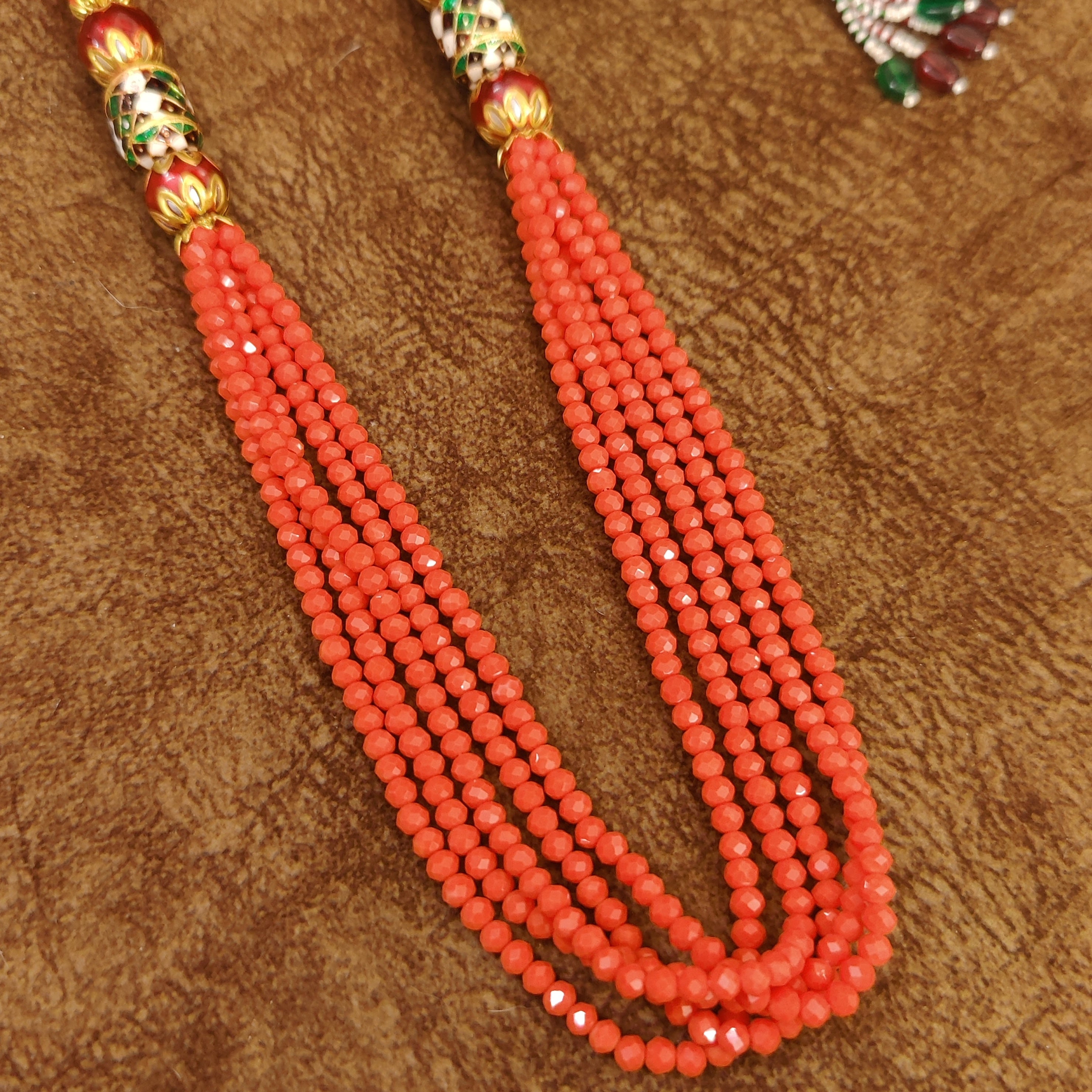 This beautiful necklace is handcrafted in beaded alloy with imitation orange crystal work of very fine quality . This necklace are coated with antique gold polish bead which give them a unique look . An absolutely stunning piece to own and are very light in weight.