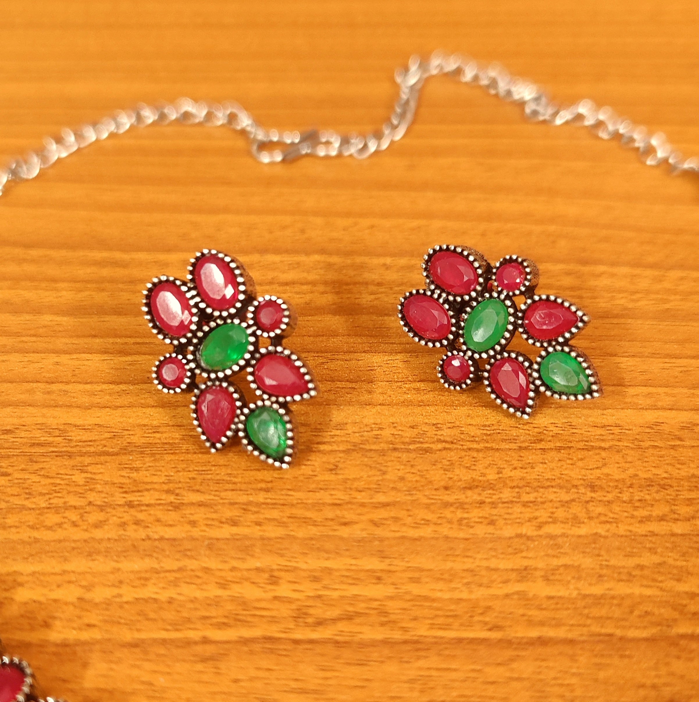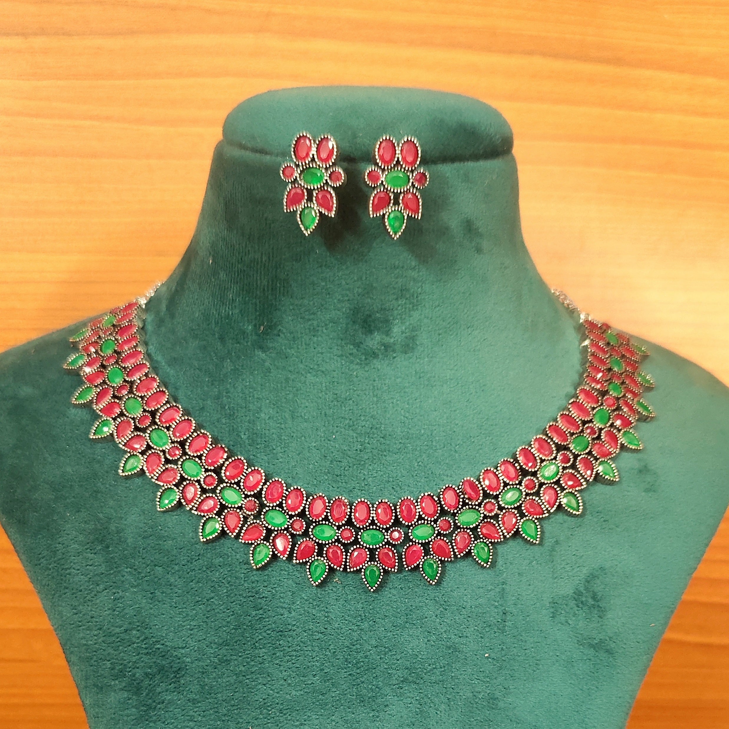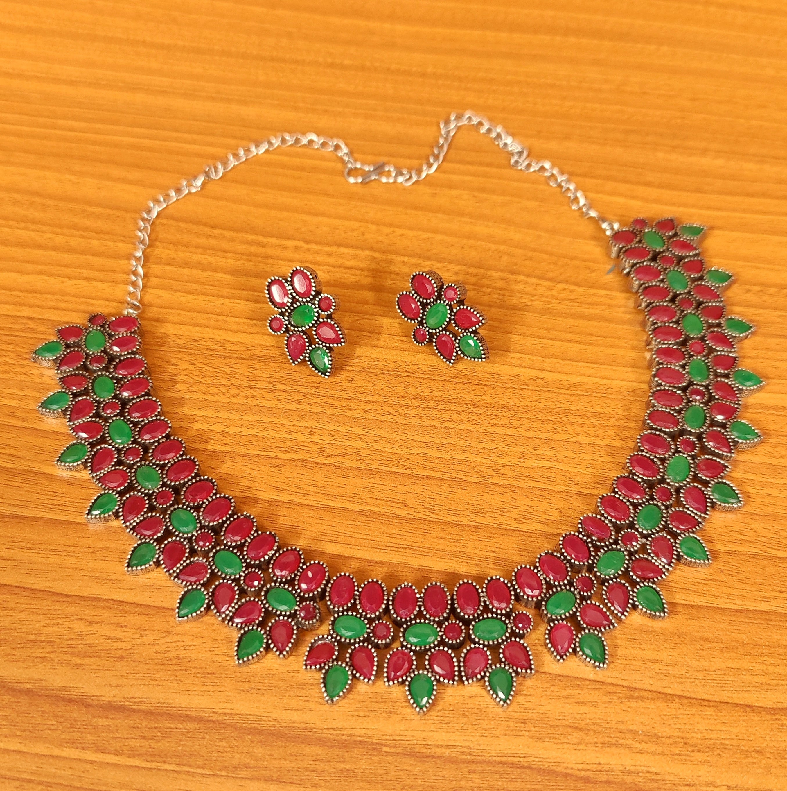 RED & GREEN COLOR STONE STUDDED OXIDISED SILVER NECKLACE SET