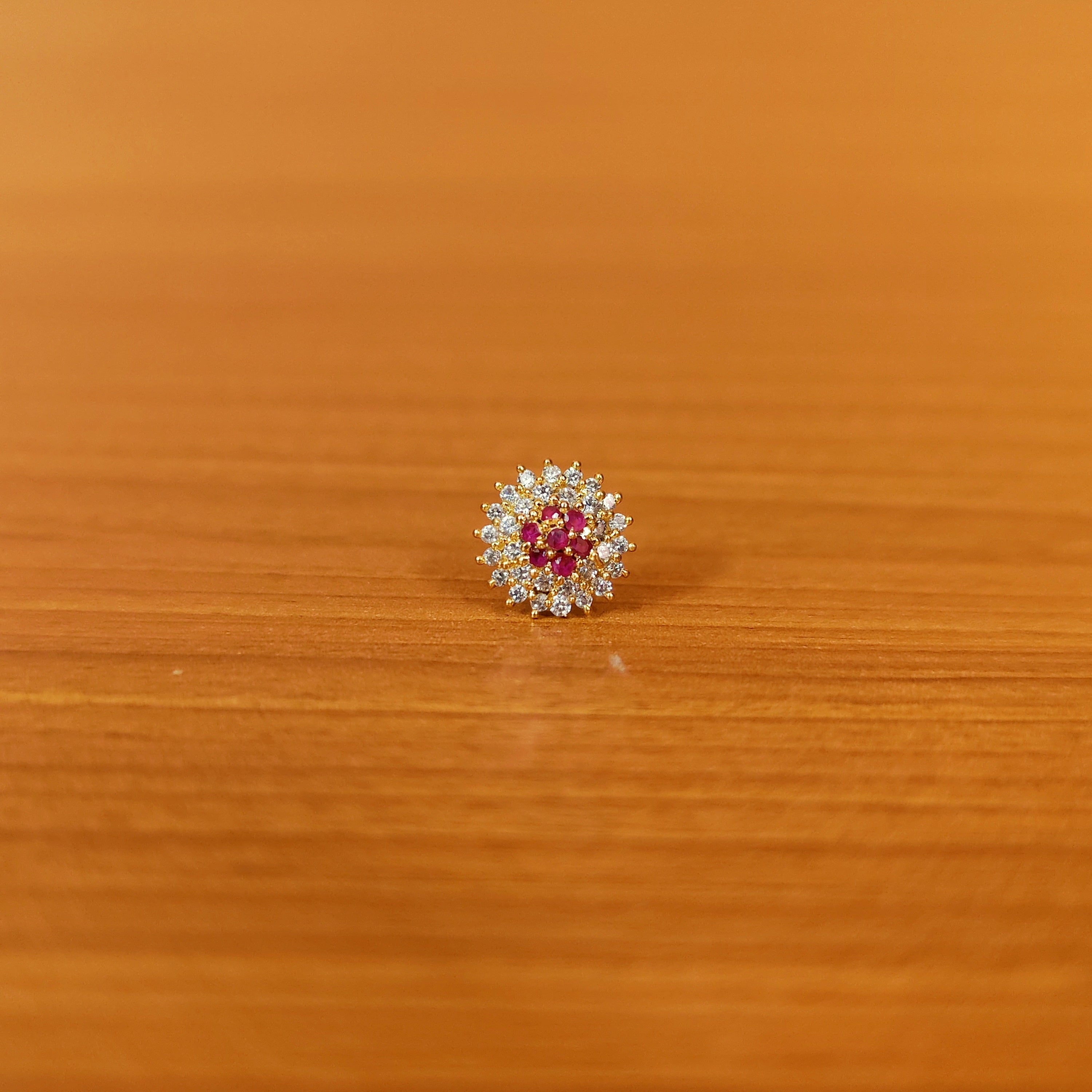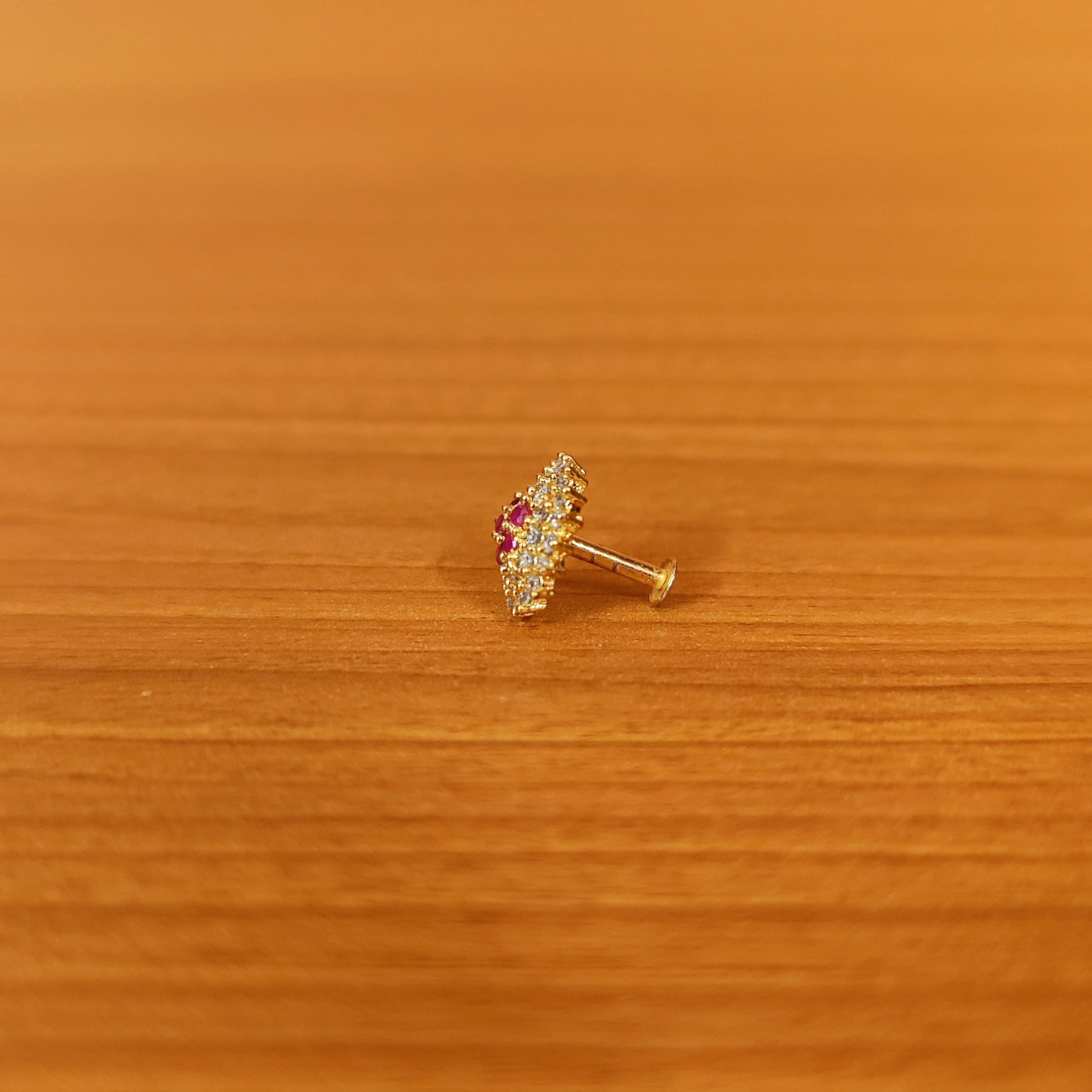This flower pattern piercing nose ring is handcrafted in silver alloy with imitation ruby colour cz stones of very fine quality , the nose ring is very light in weight and plated with 18kt gold rhodium to give it a real gold look.