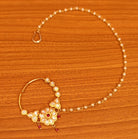 This beautiful nose ring is handcrafted in brass alloy with imitation red colour stone & cz stone and pearls of very fine quality . this nose ring is coated with 18 kt gold polish which give it a real look . an absolutely stunning piece to own and is very light in weight.
