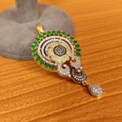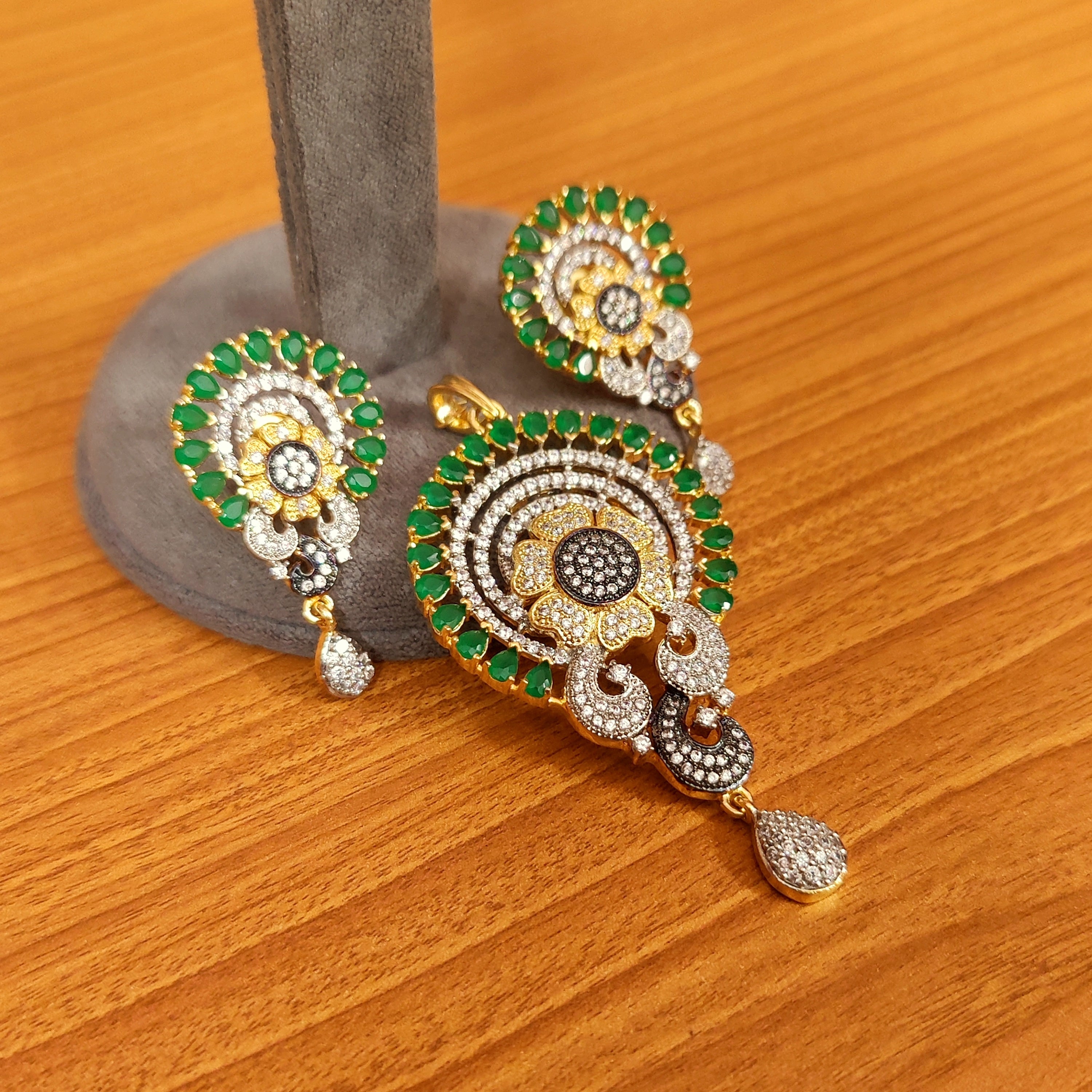 This diamond look pendant set is made in silver alloy with imitation emerald colour green stones and american diamond stones of extremely fine quality. This gorgeous pendant set is handcrafted to perfection with superior quality coloured & cz stones. This pendant set is plated with 18kt nickle free gold & black rhodium that gives the design a real gold look & comes with a matching pair of perfect size earrings which are absolutely gorgeous and are very light in weight.