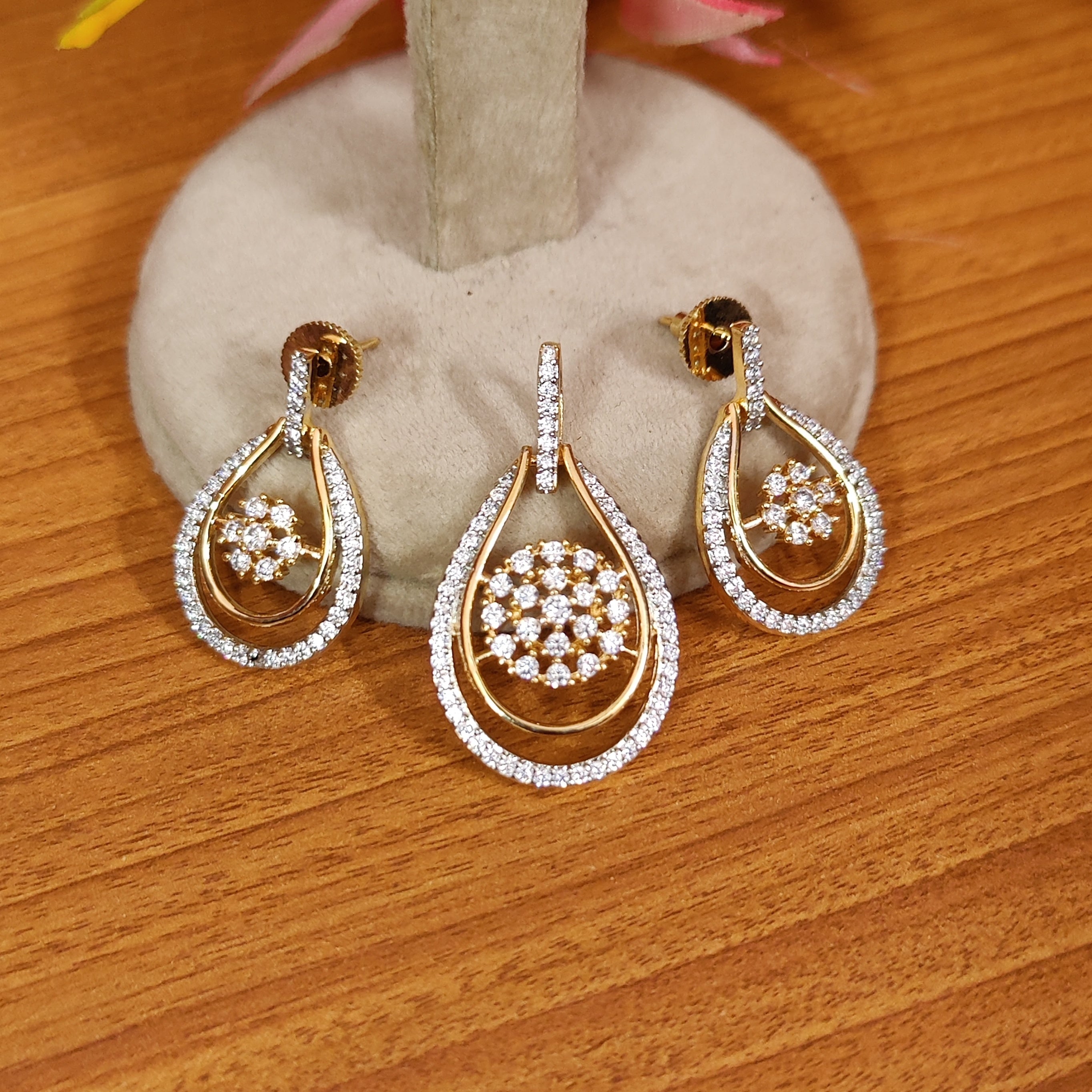 Experience the stunning elegance of this silver alloy pendant set, adorned with the finest quality american diamonds and handcrafted to perfection with superior cz stones. Plated with 18kt gold rhodium, this set exudes a real diamond look and includes a matching pair of lightweight and breathtaking earrings.