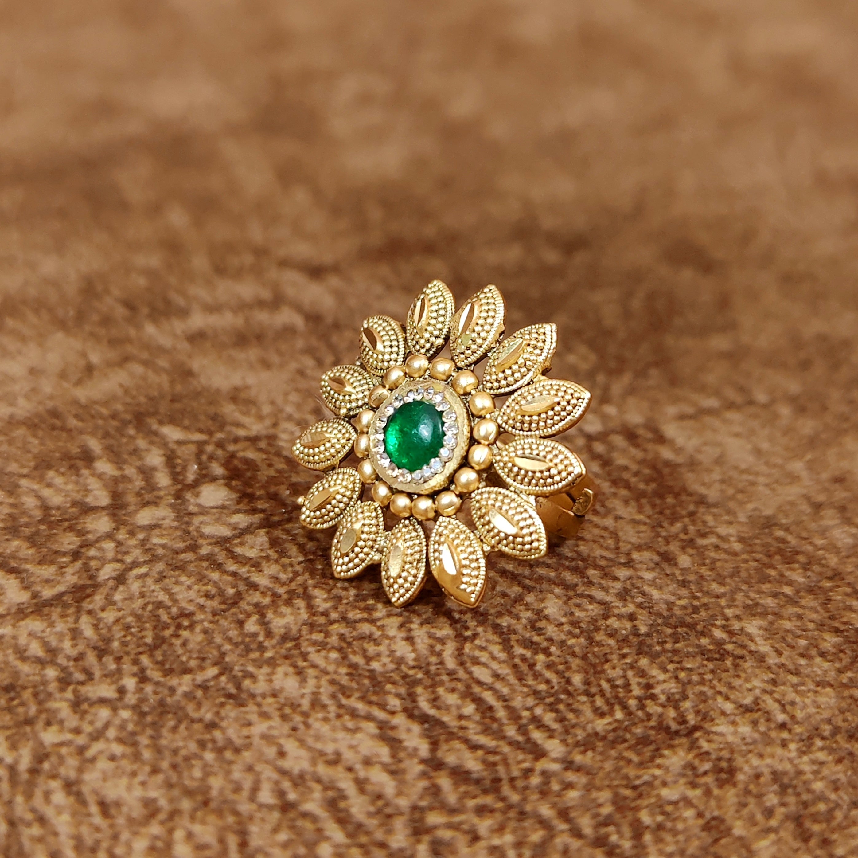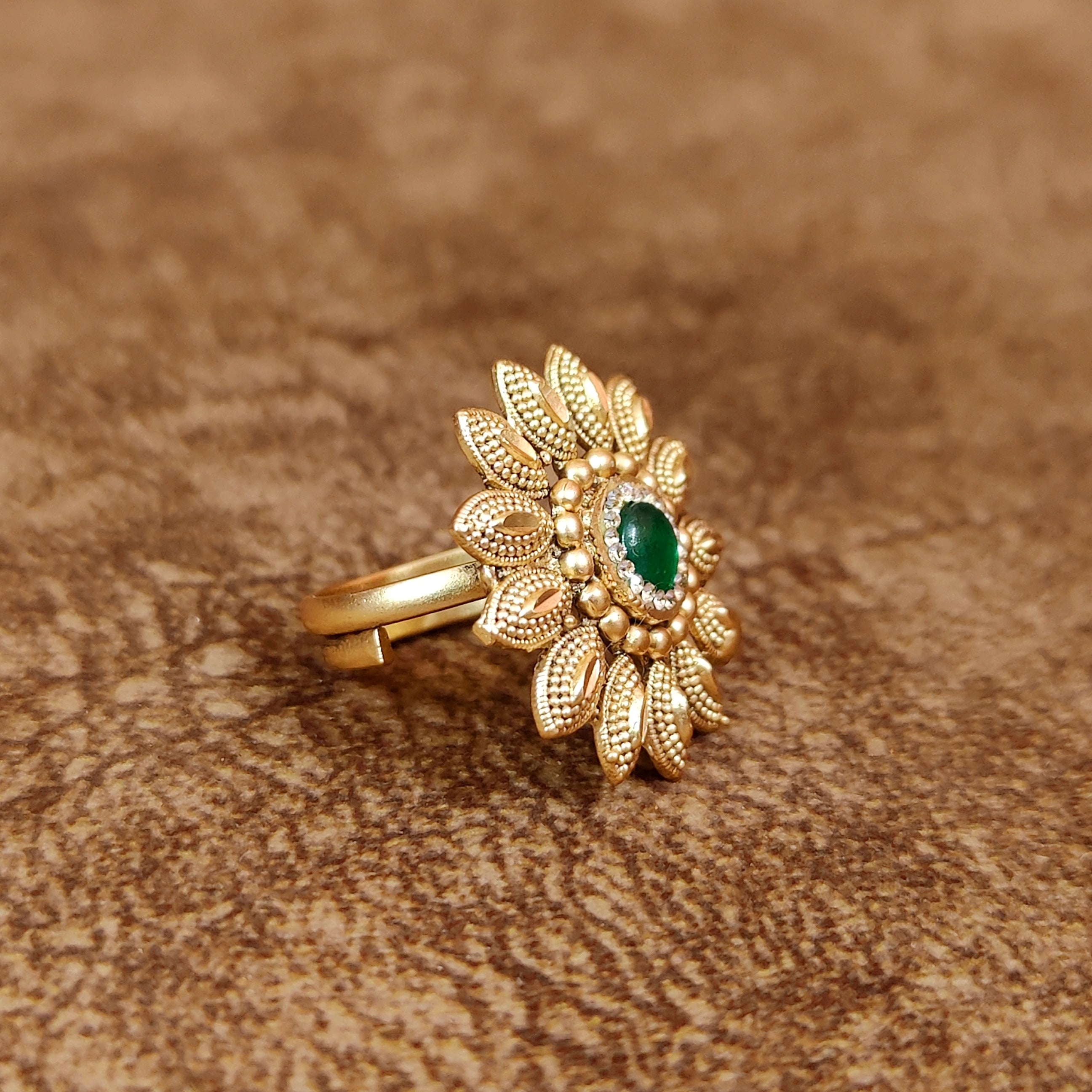 Exude elegance with the Emerald Antique Matt Finish Adjustable Cocktail Ring. Featuring a radiant emerald-green centerpiece set in an antique matt gold finish, this ring is a masterpiece of timeless charm and sophistication. Its adjustable design ensures a flawless fit for all, making it a versatile choice for weddings, cocktail parties, or festive occasions. Whether paired with traditional attire or contemporary outfits, this ring adds a stunning finishing touch to your ensemble.