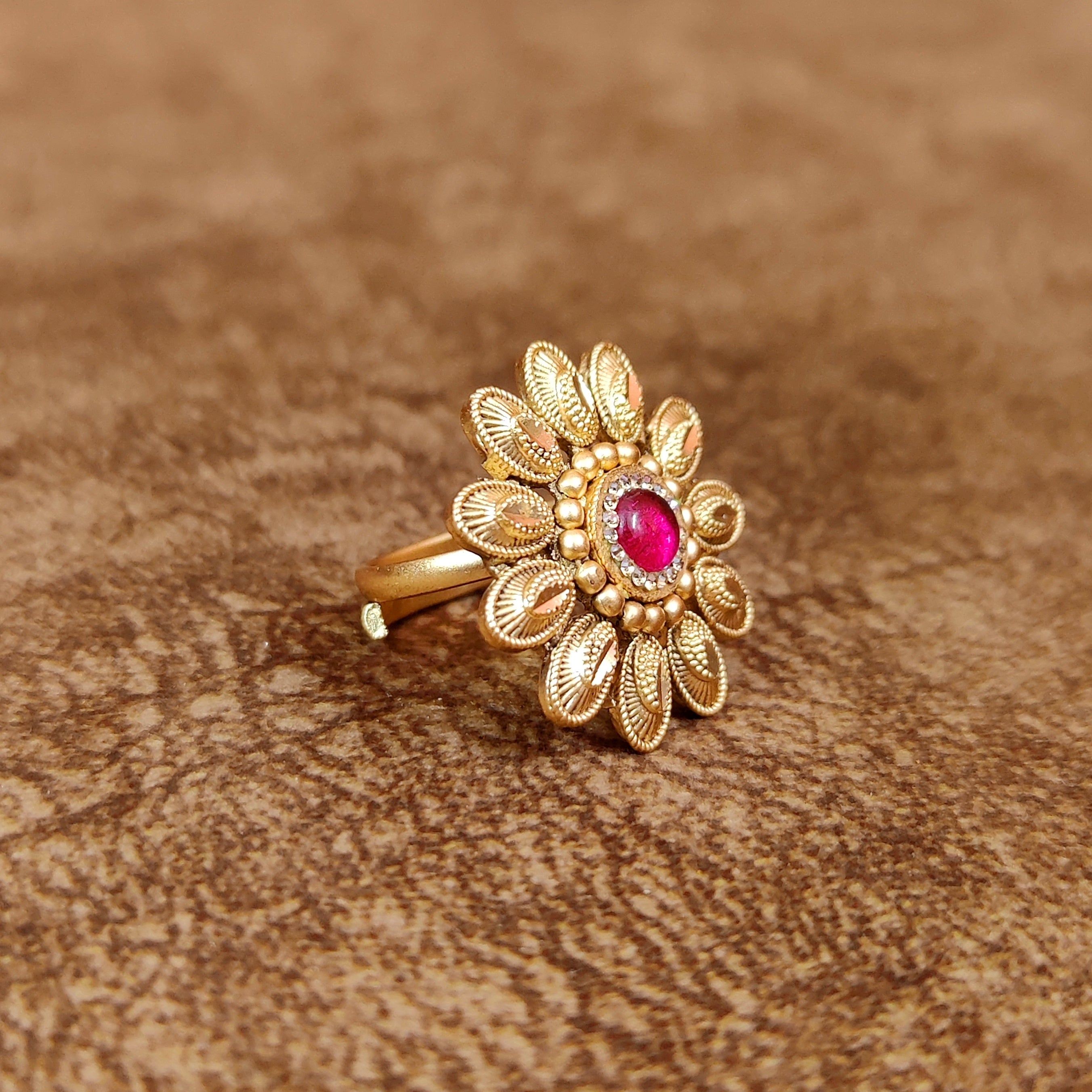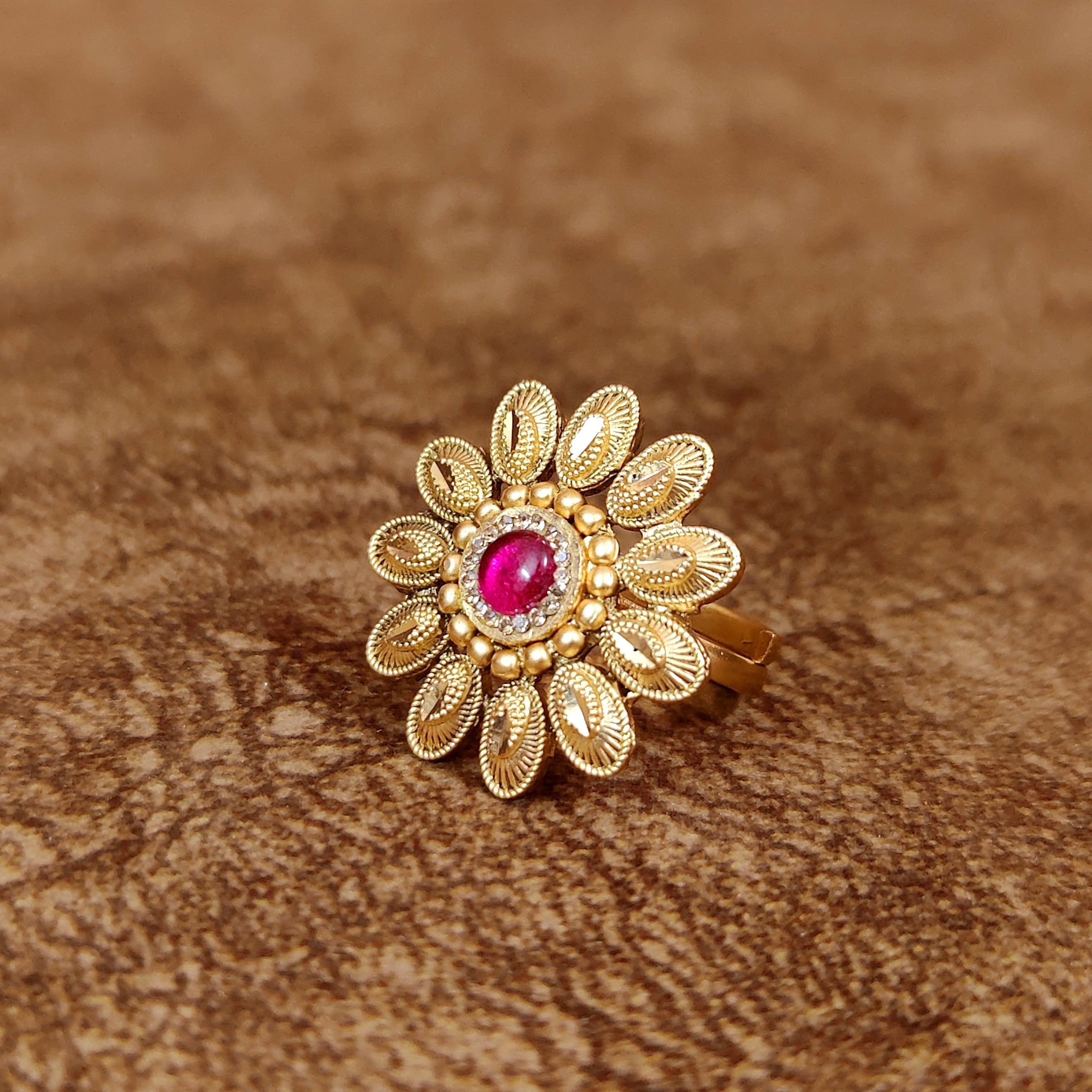 Make a bold style statement with the Red Antique Gold Pattern Adjustable Cocktail Ring. This exquisite piece showcases a vibrant red centerpiece set in an intricate antique gold design, radiating timeless elegance. The adjustable fit ensures it suits every wearer, making it a perfect accessory for weddings, festive events, or cocktail parties. Pair it with ethnic or modern outfits to add a regal touch to your look and leave a lasting impression.