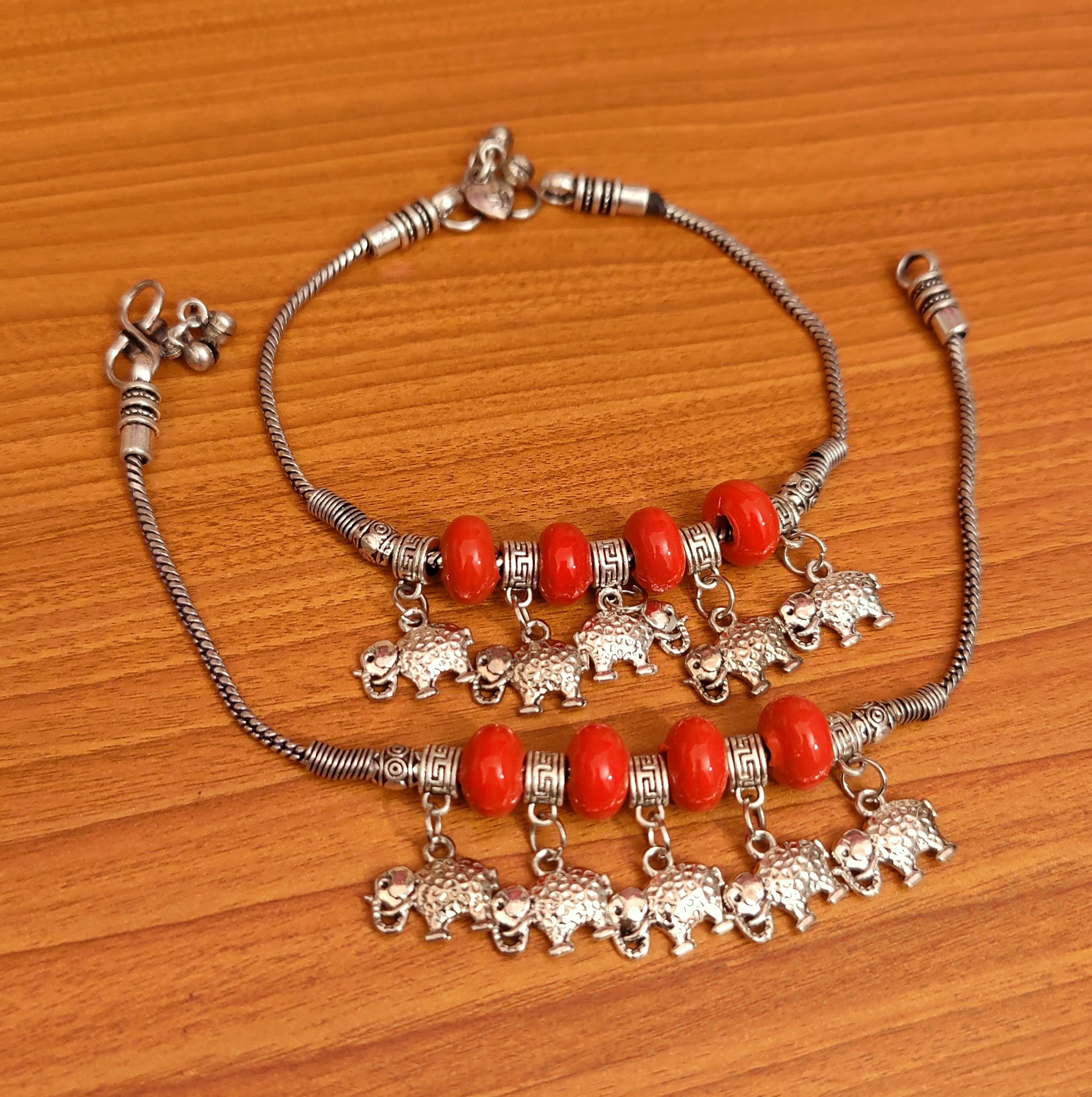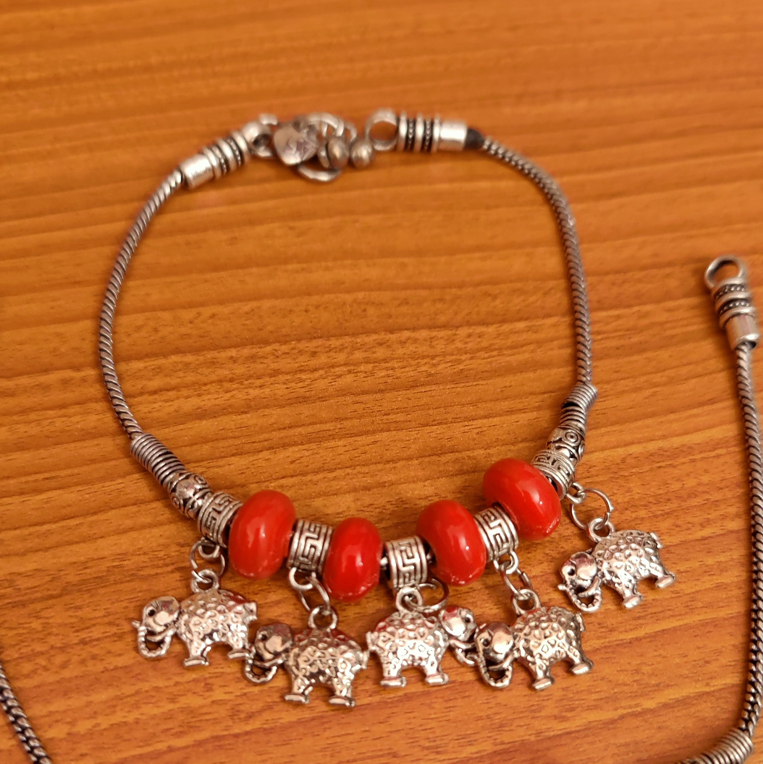 These oxidised silver plated anklets are handcrafted in metal alloy with silver plated elephant shaped metal motifs and red coral beads. These anklets are plated in fine silver plating and are very lght in weight.