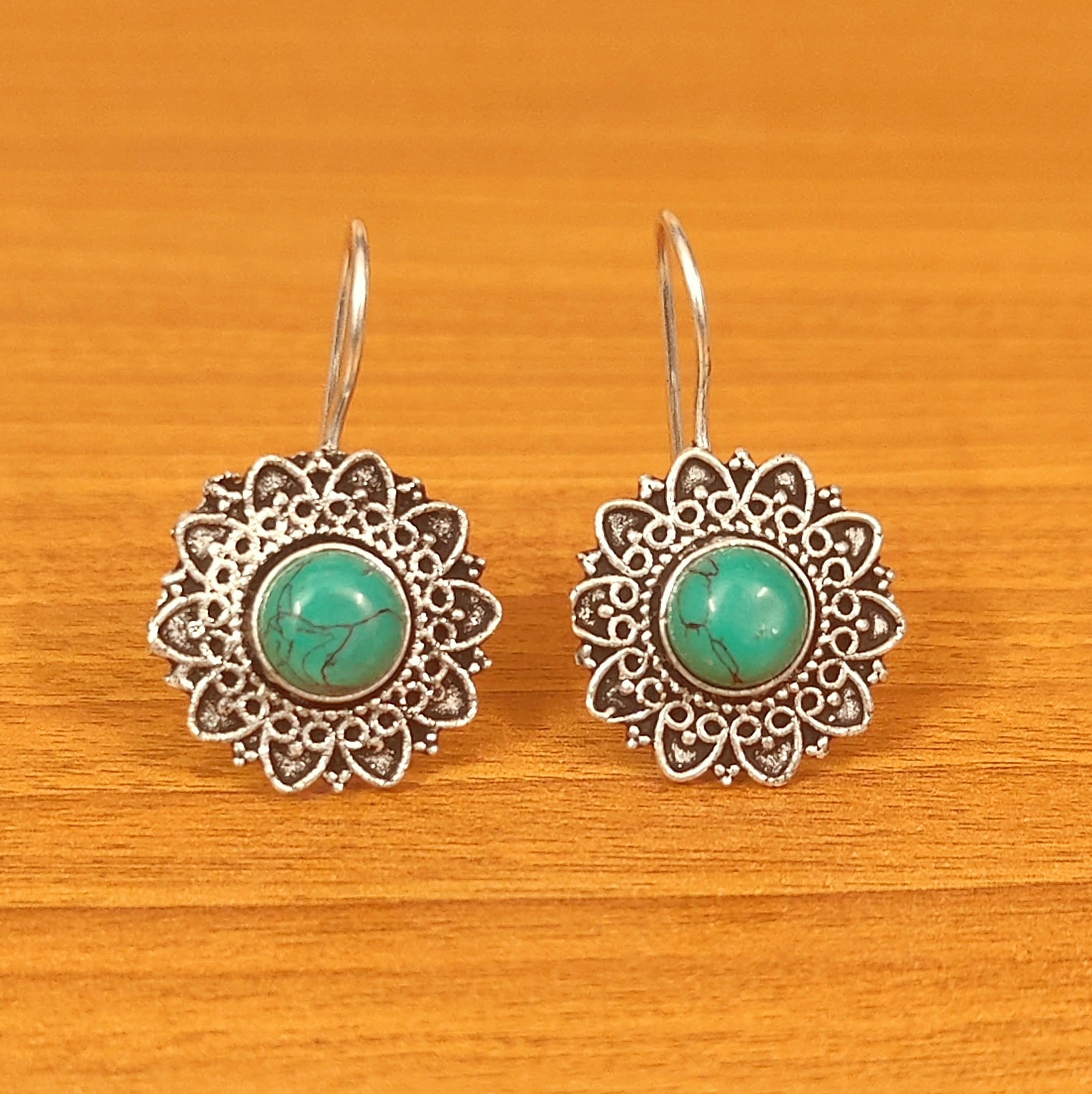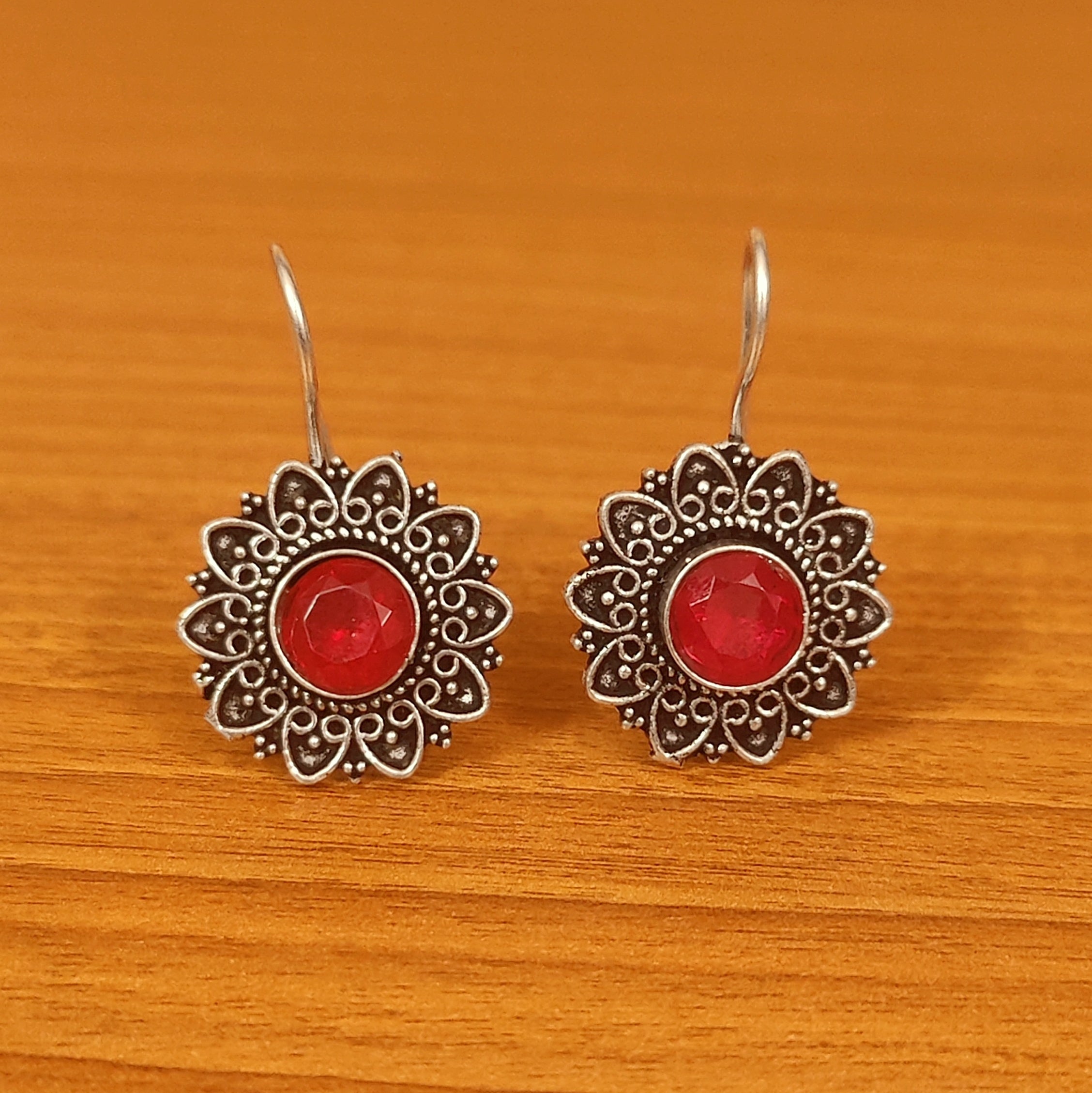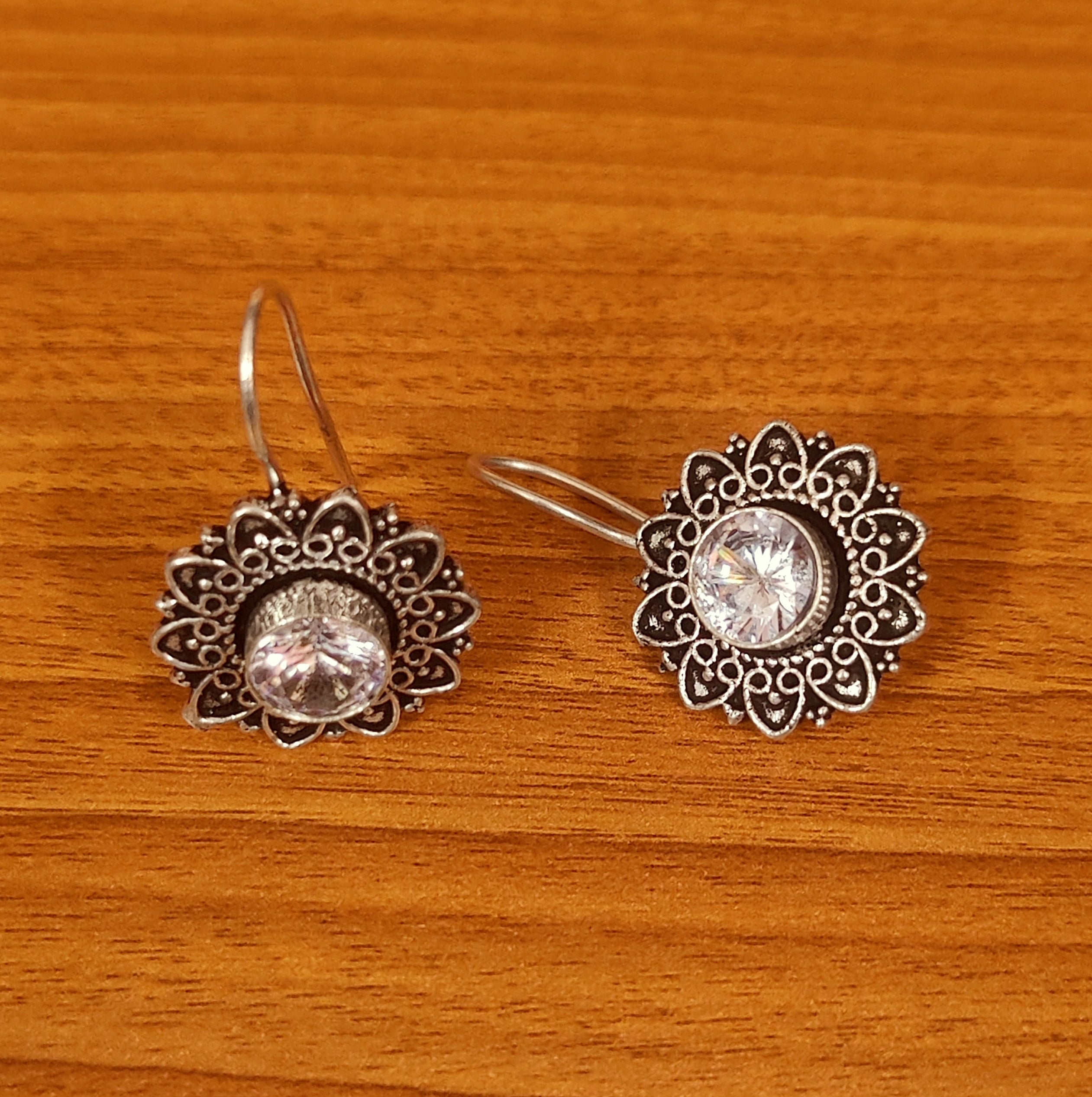These silver lookalike earrings are handcrafted in copper alloy with imitation american diamond stones of very fine quality. These simple and light weight earrings are plated with fine nickle free antique silver plating that gives a real silver look to the design.