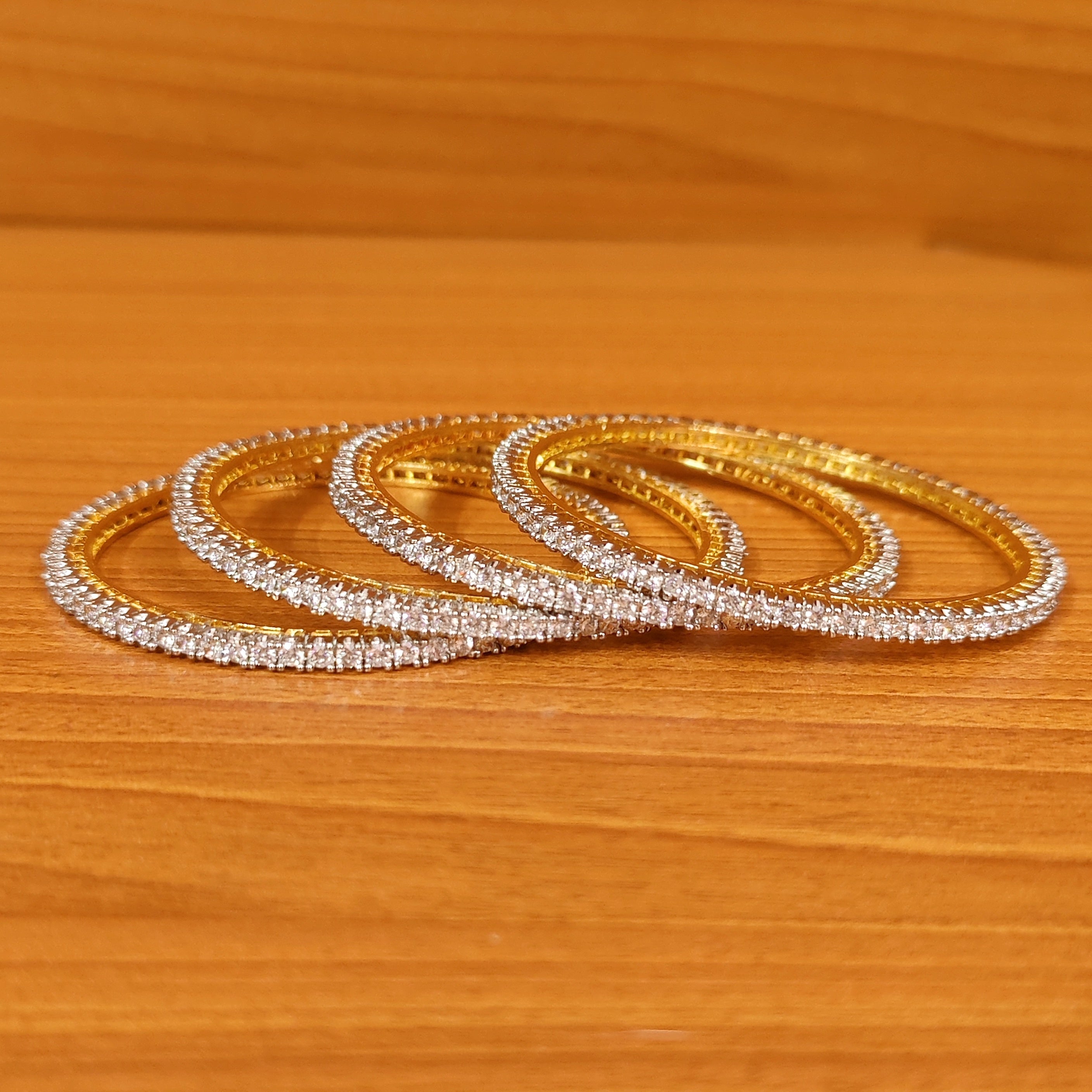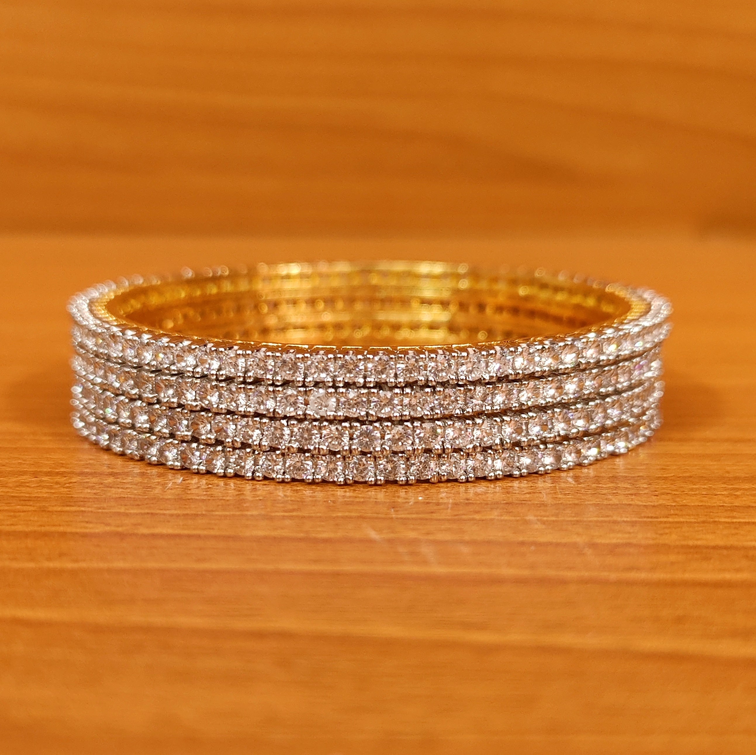 These diamond look bangles are handcrafted in silver alloy with imitation american diamond stones of 4mm size of very fine quality. These bangles are coated with 18 kt gold plating that gives a real look to the design , these bangles are very light in weight and comes as a set of 4 bangles.