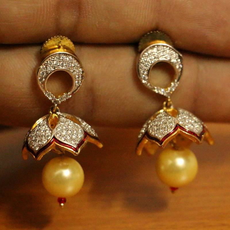 These diamond look jhumkas are handcrafted in silver alloy with imitation pearls & cz stones of very fine quality. These earrings are plated in 18kt gold rhodium plating which gives the design a real jewelry look .
