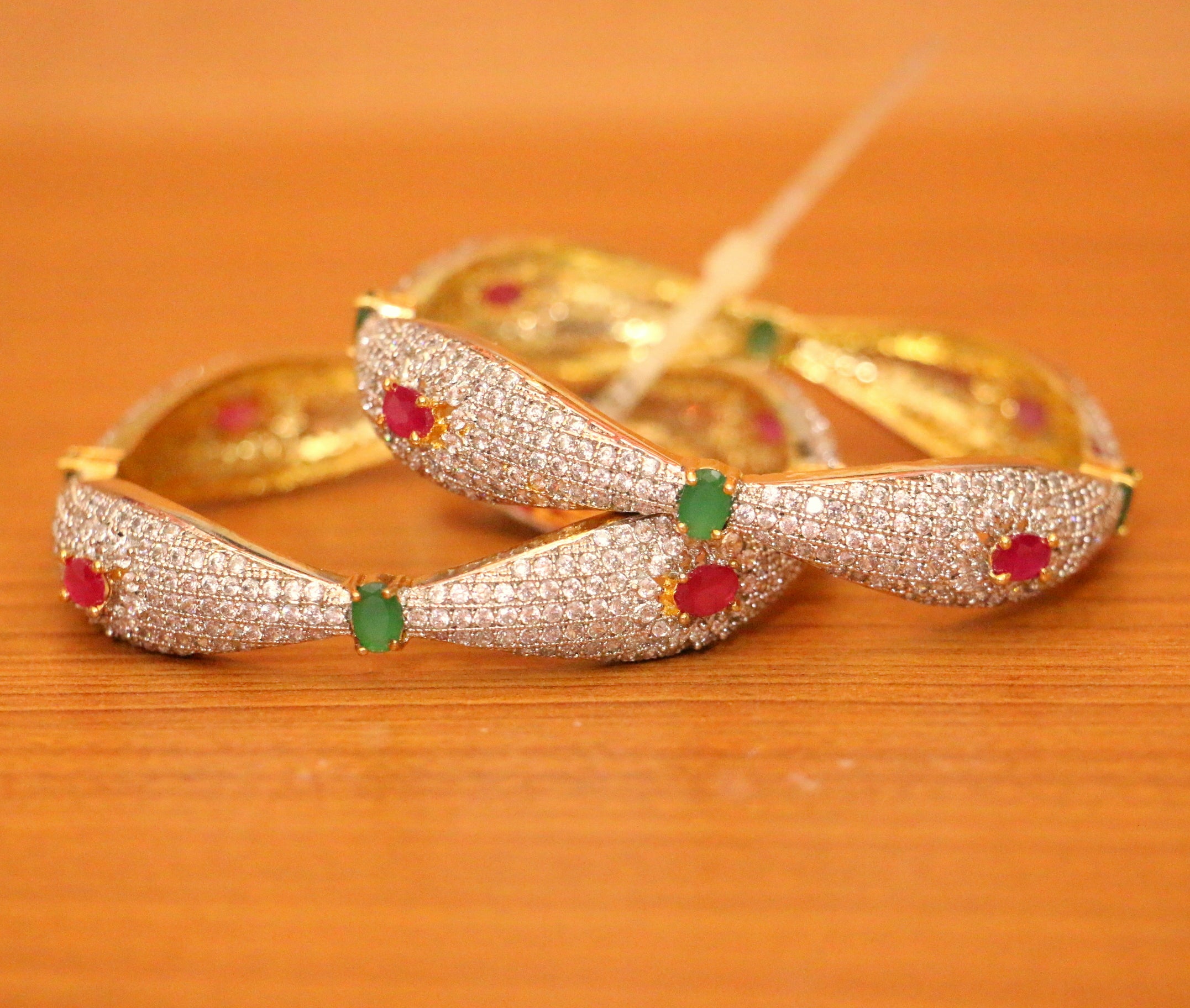 These bangles are handcrafted in silver & brass alloy with imitation red ruby, green onyx & cz stones of very fine quality. These artistic yet modern bangles are plated with fine nickle free gold rhodium to avoid any allergies to the skin.