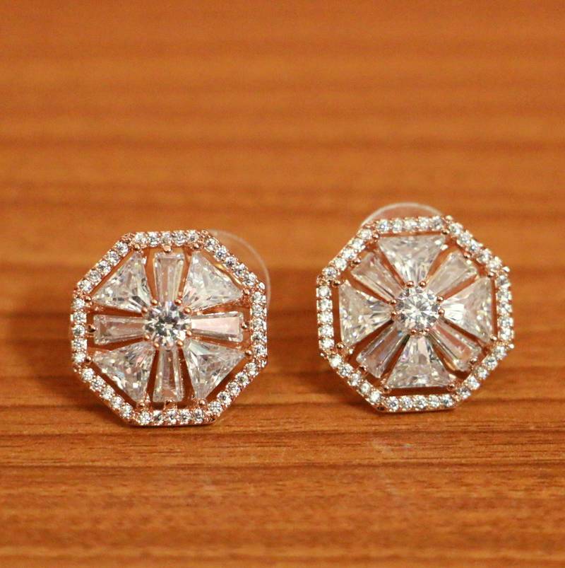 These diamond look studs are handcrafted in silver alloy with imitation cz stones of very fine quality. These earrings are plated in 18kt rose gold rhodium plating which gives the design a real jewelry look ,these earrings are very light in weight.
