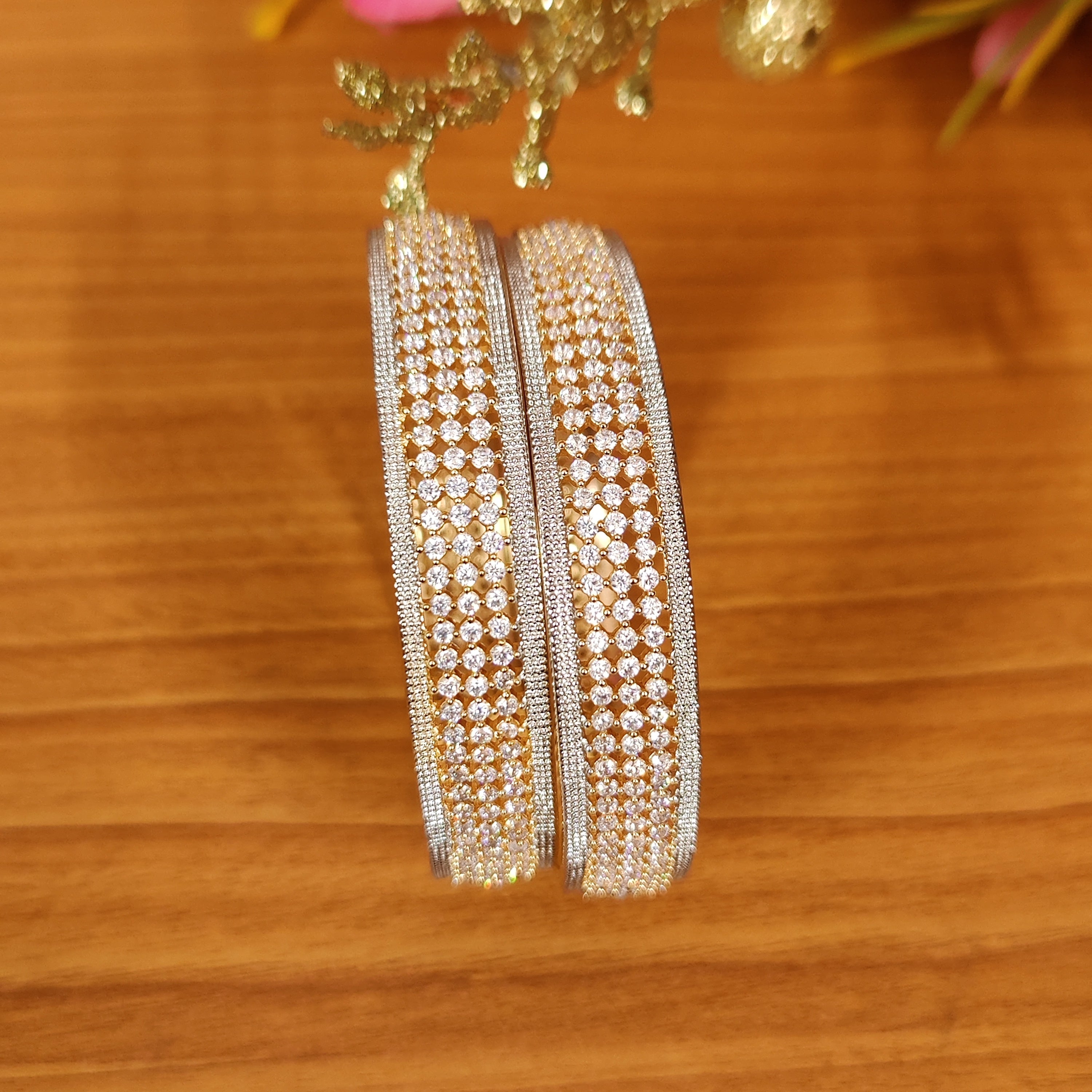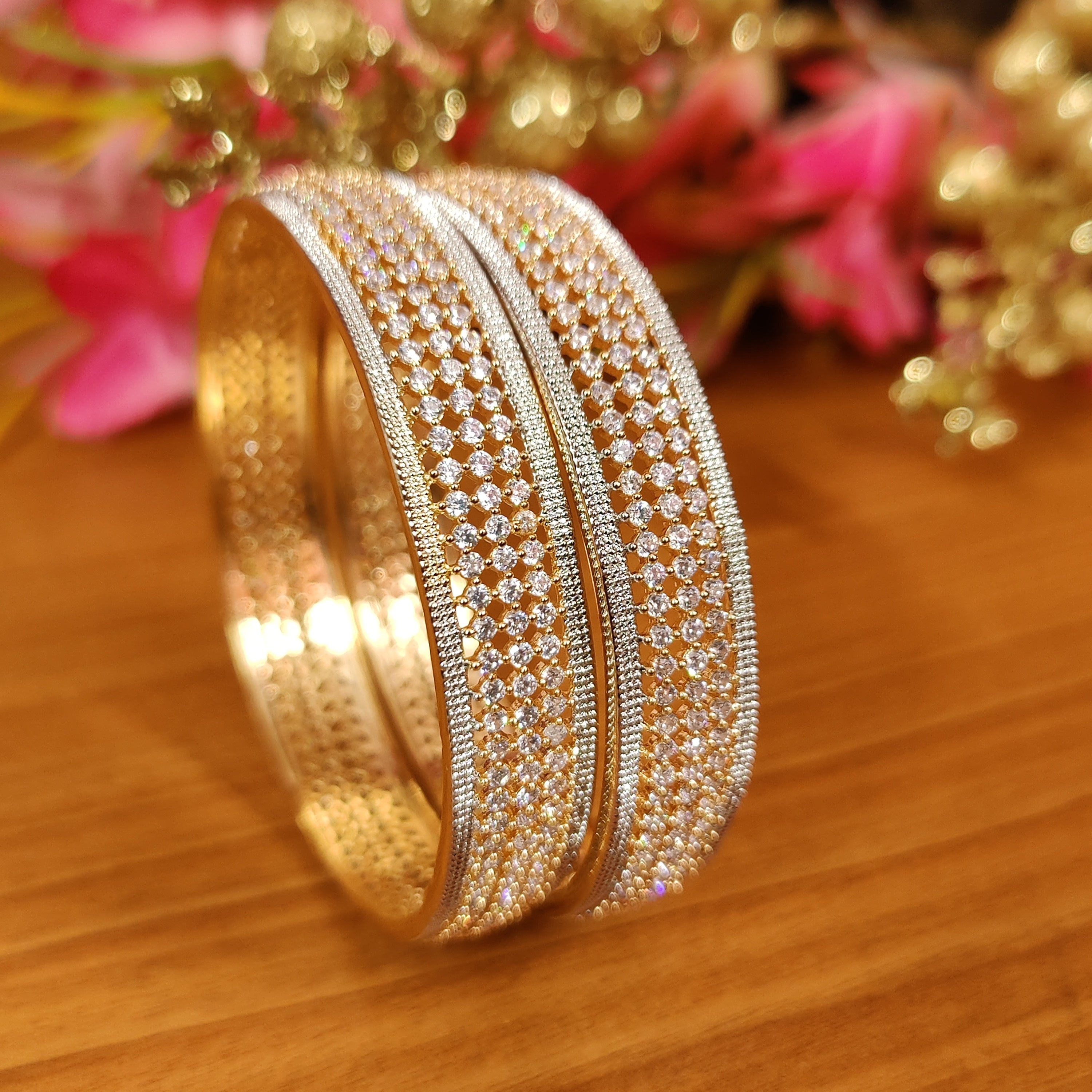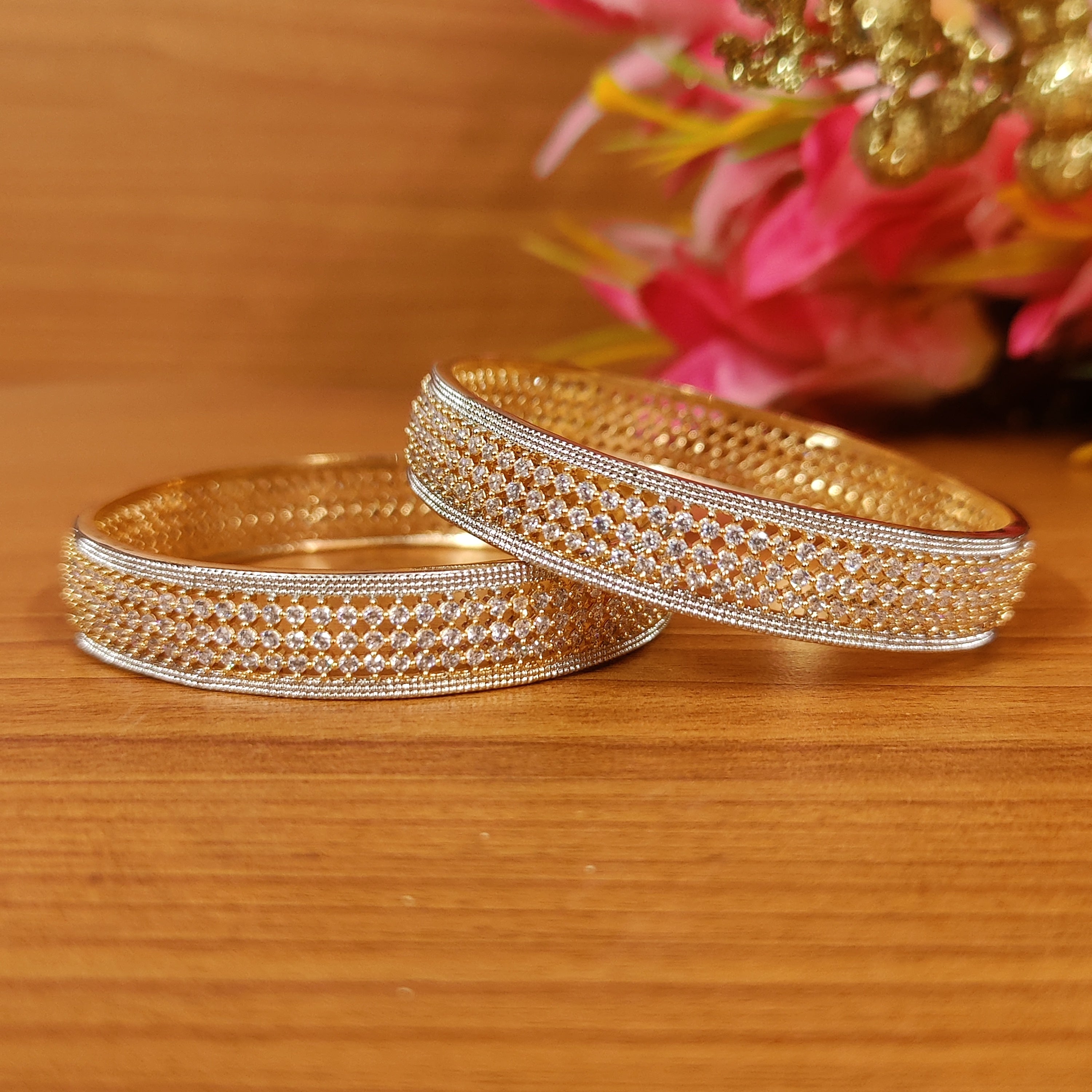 Elevate your jewelry collection with our Diamond Pattern Gold-Plated CZ Bangles. Designed with intricate diamond patterns and adorned with high-quality cubic zirconia stones, these bangles offer a dazzling sparkle that mimics the brilliance of real diamonds. The rich gold plating enhances their luxurious appeal, making them perfect for both special occasions and everyday elegance. Pair these bangles with any attire for a sophisticated, timeless look.