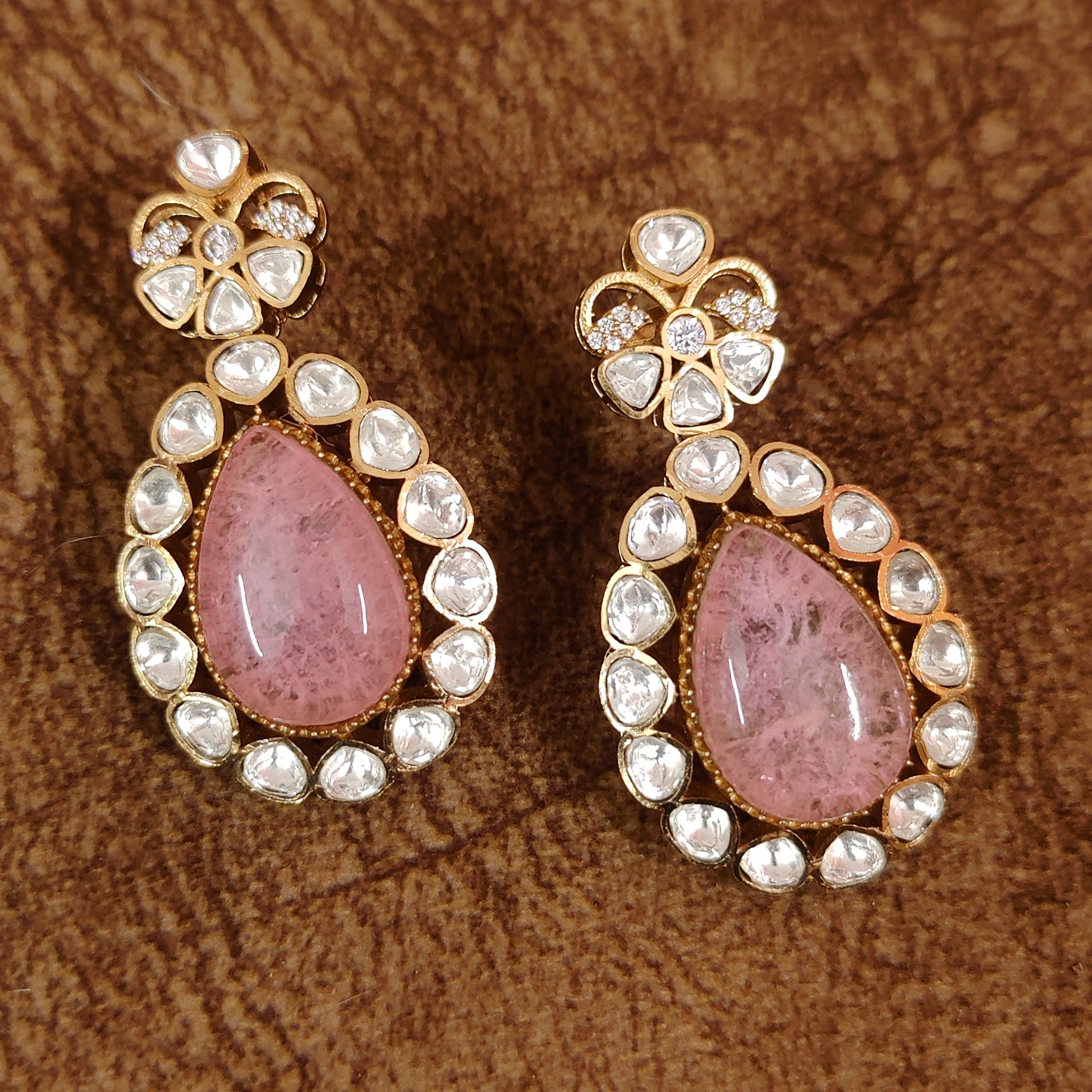 These Doublet Stone Danglers are handcrafted in silver and brass alloy with imitation Moissanite Polki of very fine quality. These medium sized party wear Danglers are handcrafted with fine finishihng and plated with real 18kt fine nickel free gold rhodium that gives a real diamond look to the design.