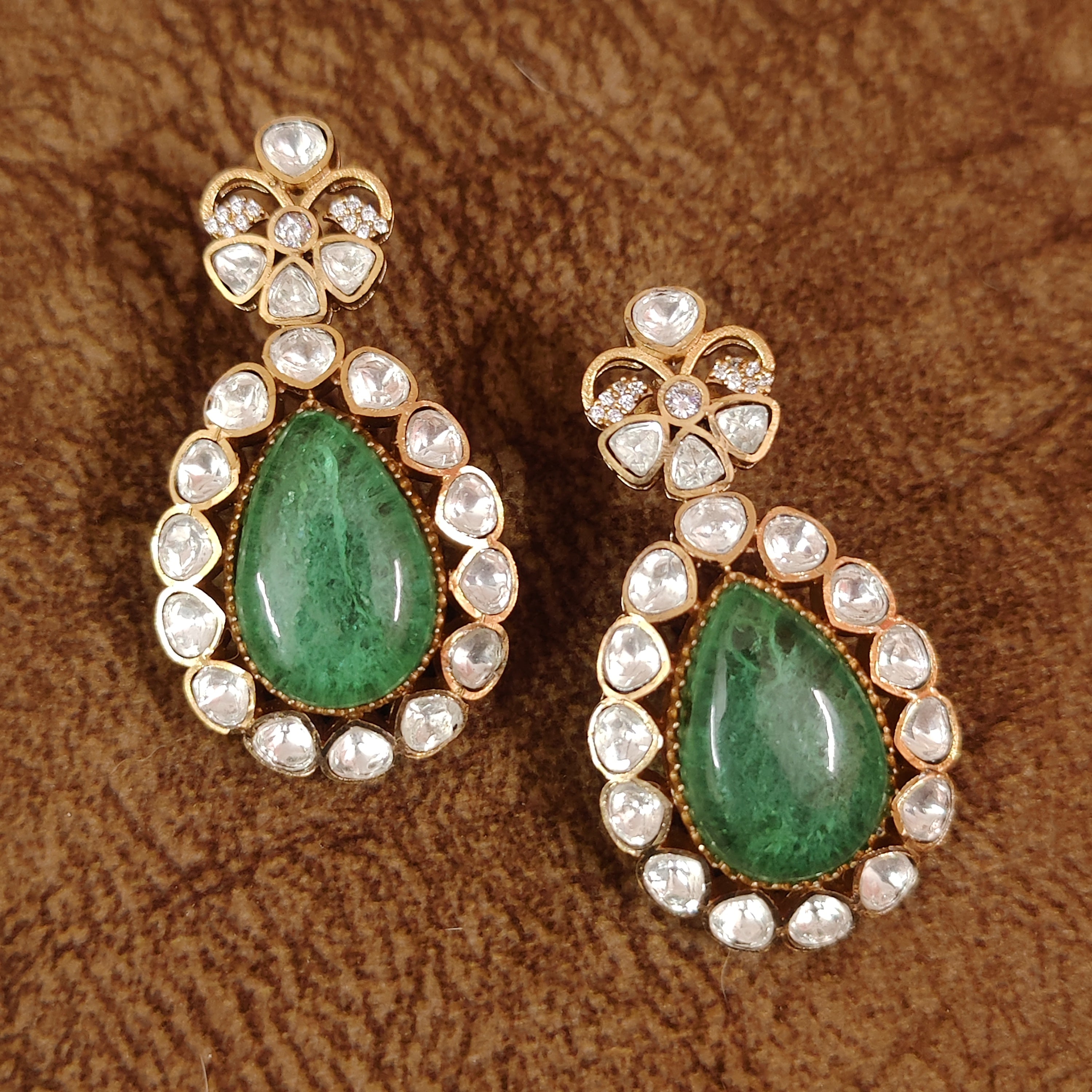 EMERALD DOUBLET STONE STUDDED GOLD PLATED MOISSANITE POLKI DANGLERS