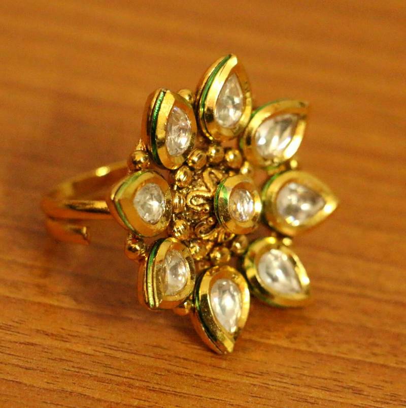 This beautiful ring is handcrafted in brass alloy with imitation kundan work of very fine quality . This ring is coated with 18 kt gold polish which give them a unique look . An absolutely stunning piece to own and are very light in weight.