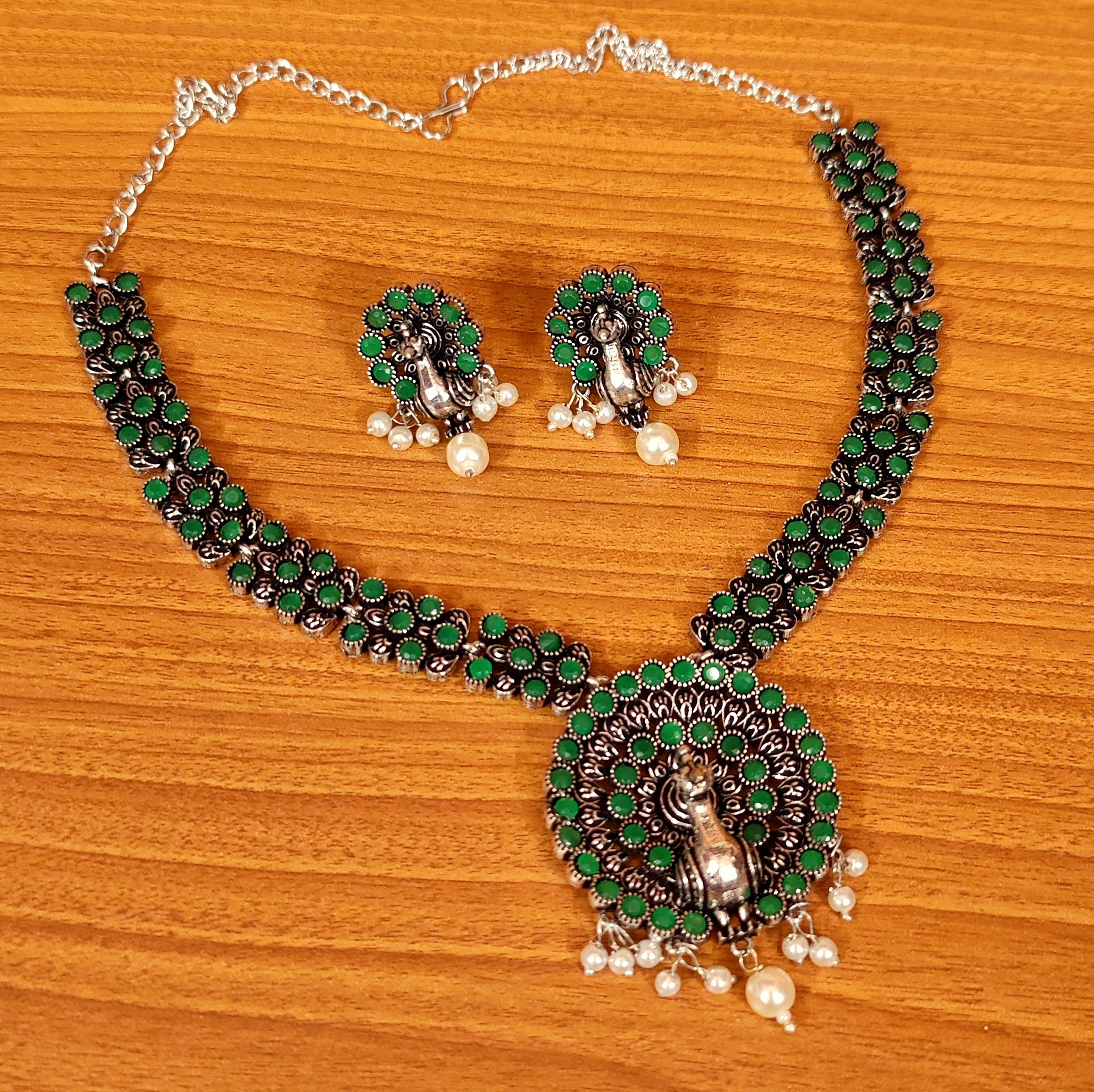 EMERALD COLOUR PEACOCK OXIDISED SILVER NECKLACE SET