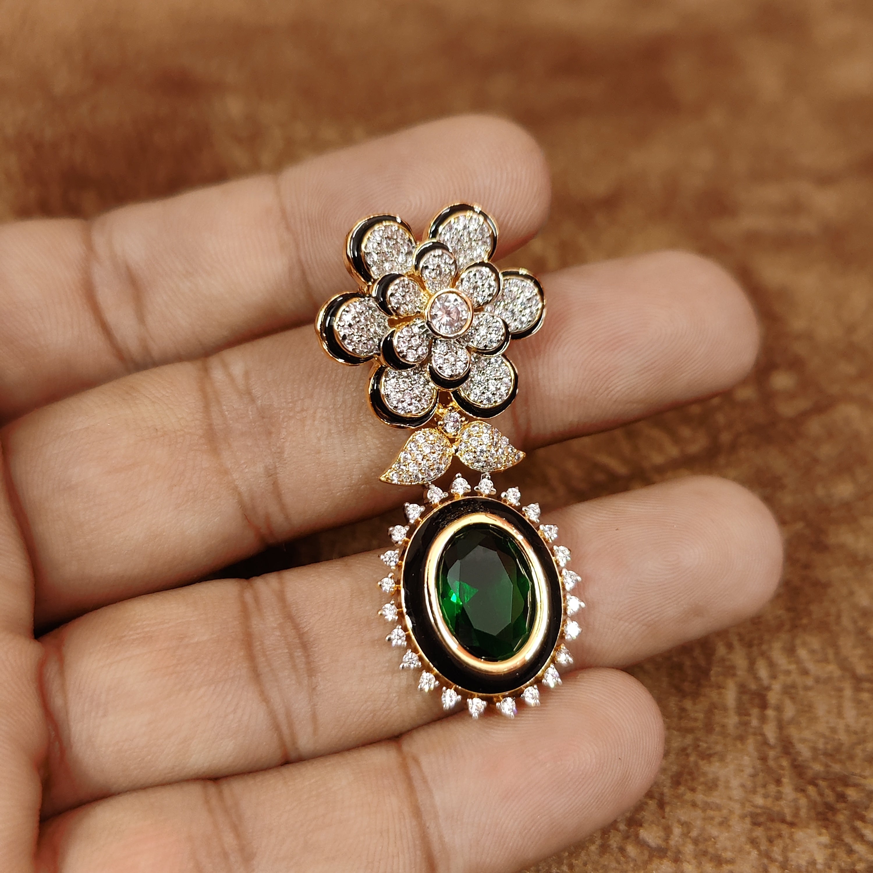 Add a touch of elegance to your outfit with our stunning Emerald Danglers. These earrings feature vibrant emerald colour cz stones paired with the finest quality american diamond. The intricate black meenakari work adds a unique touch to the modern design. Made with lightweight gold plating, they are perfect for any occasion.