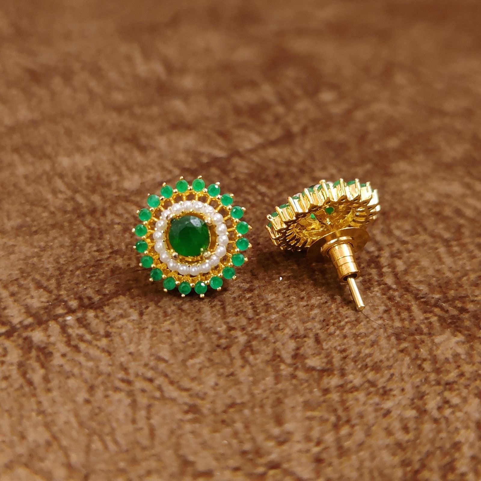 The premium gold polish adds a refined finish that enhances the richness of the stones while maintaining a classic designer look. Their elegant stud style makes them perfect for weddings, festive occasions, traditional events, and stylish everyday wear.