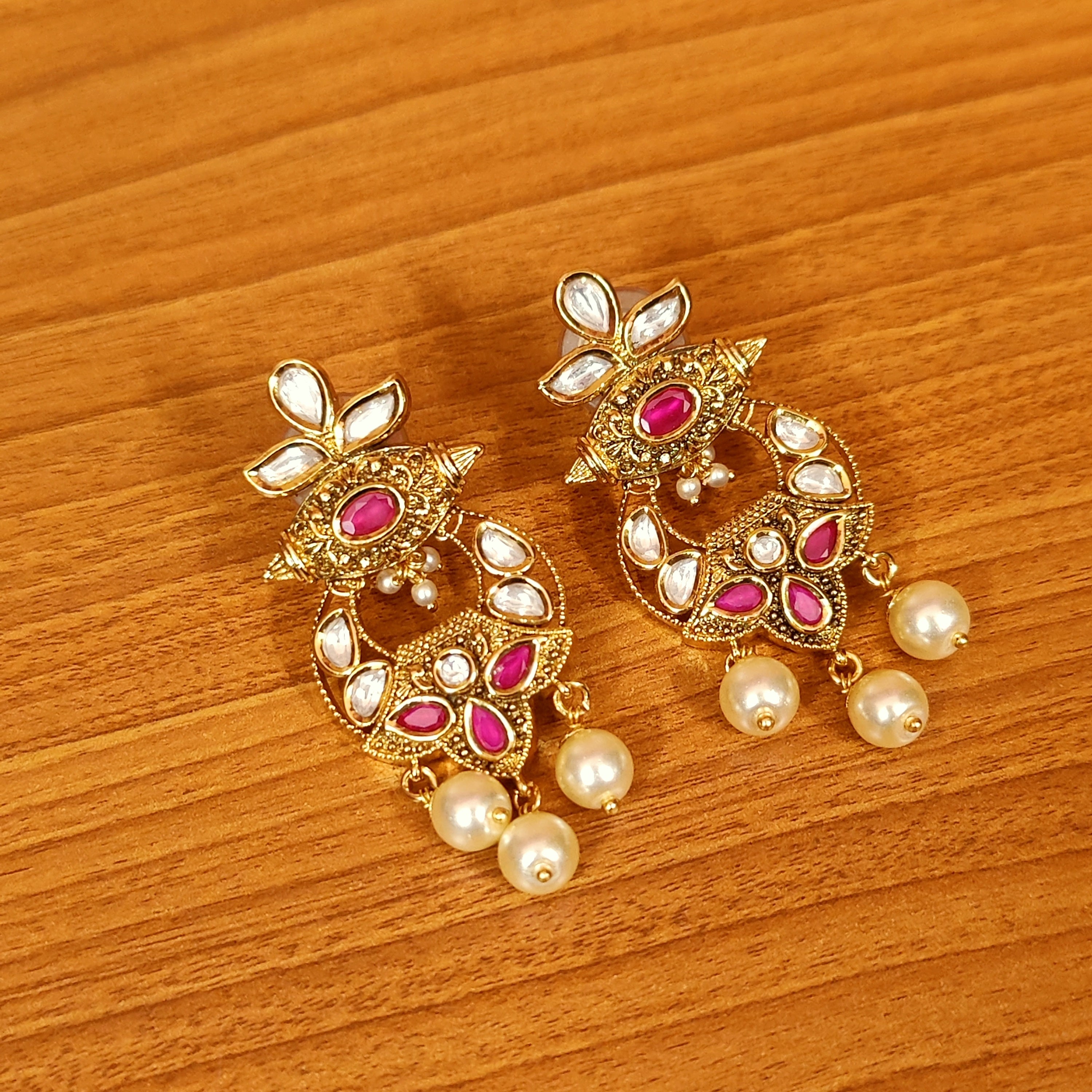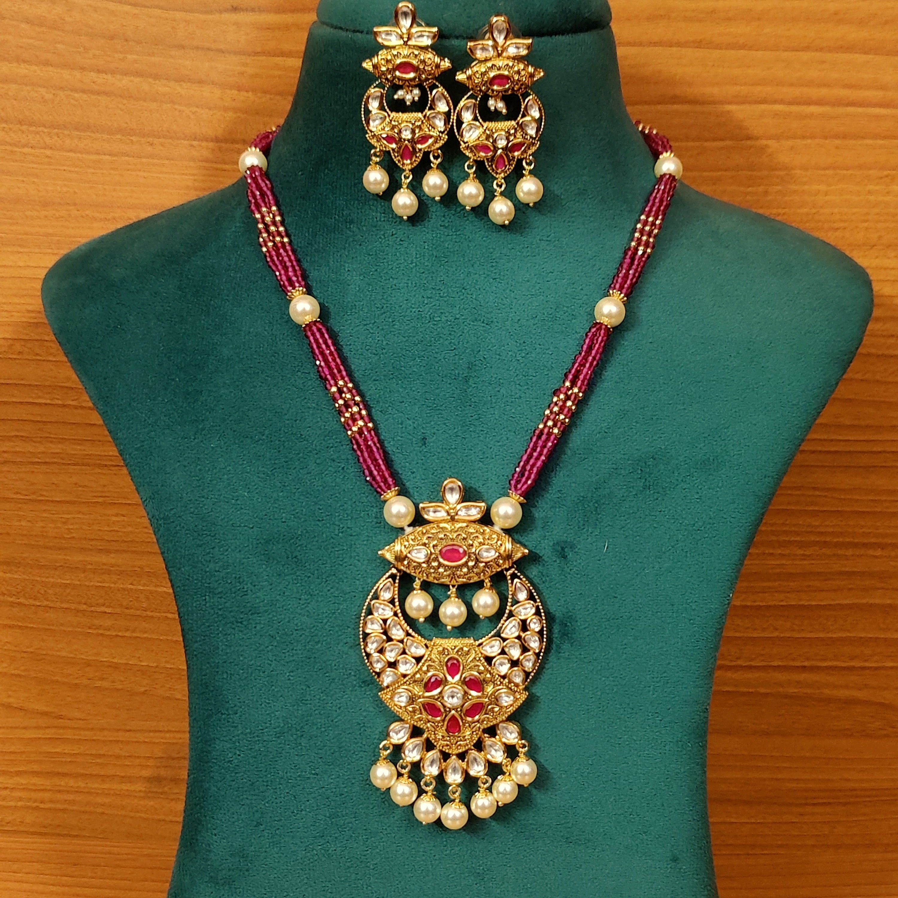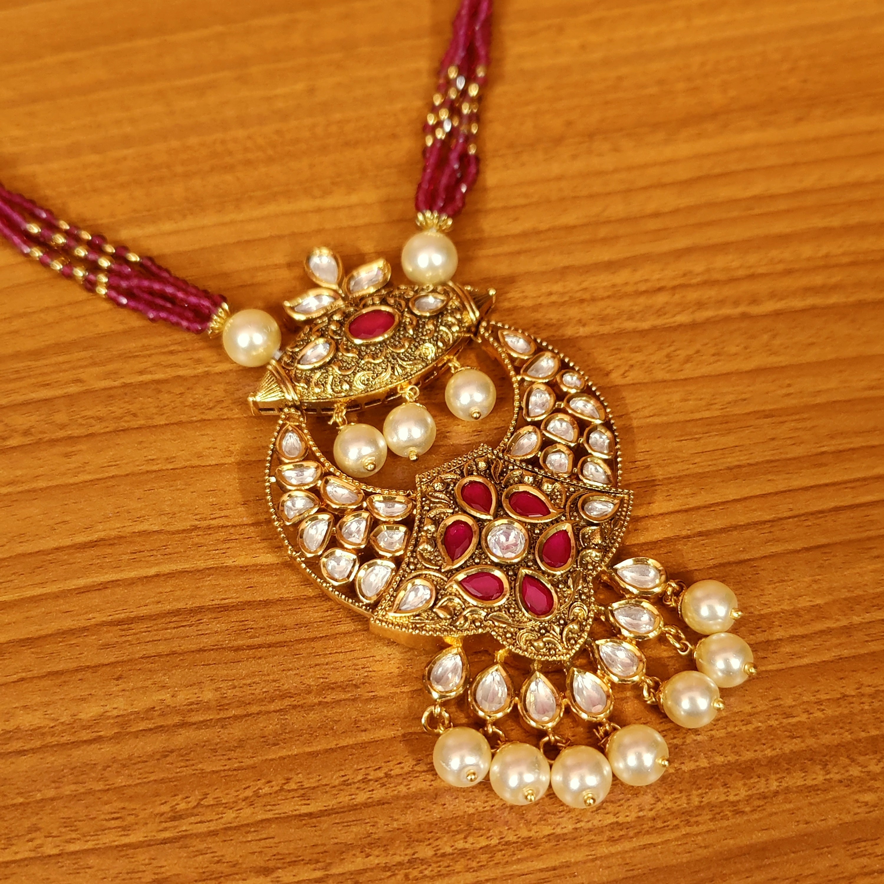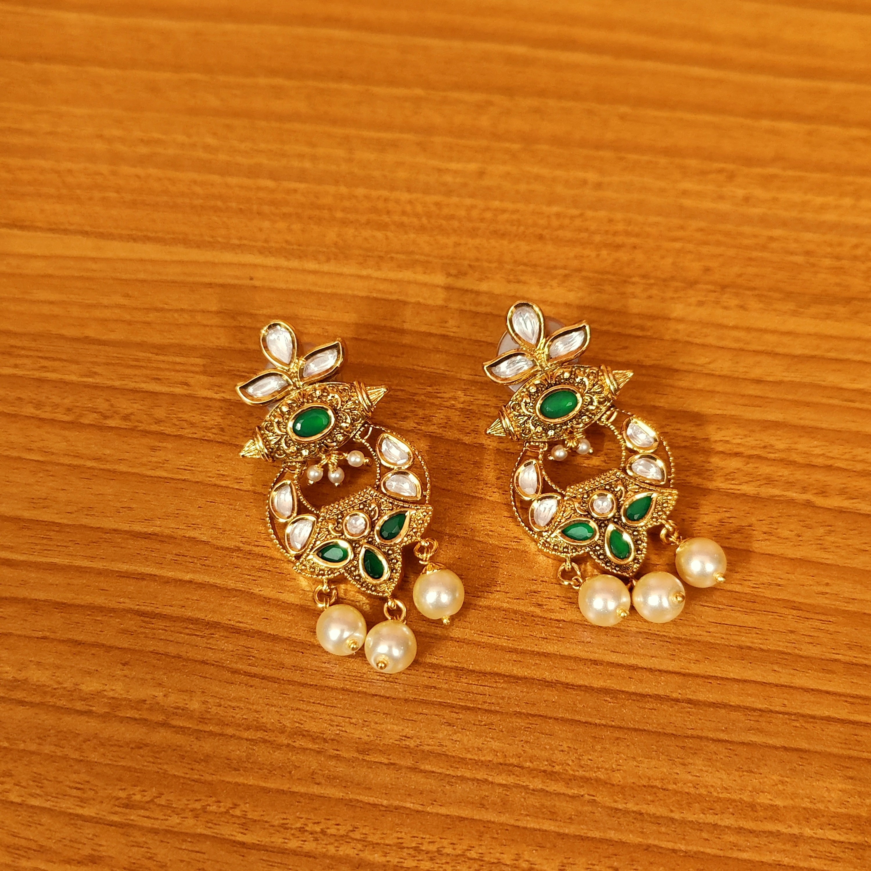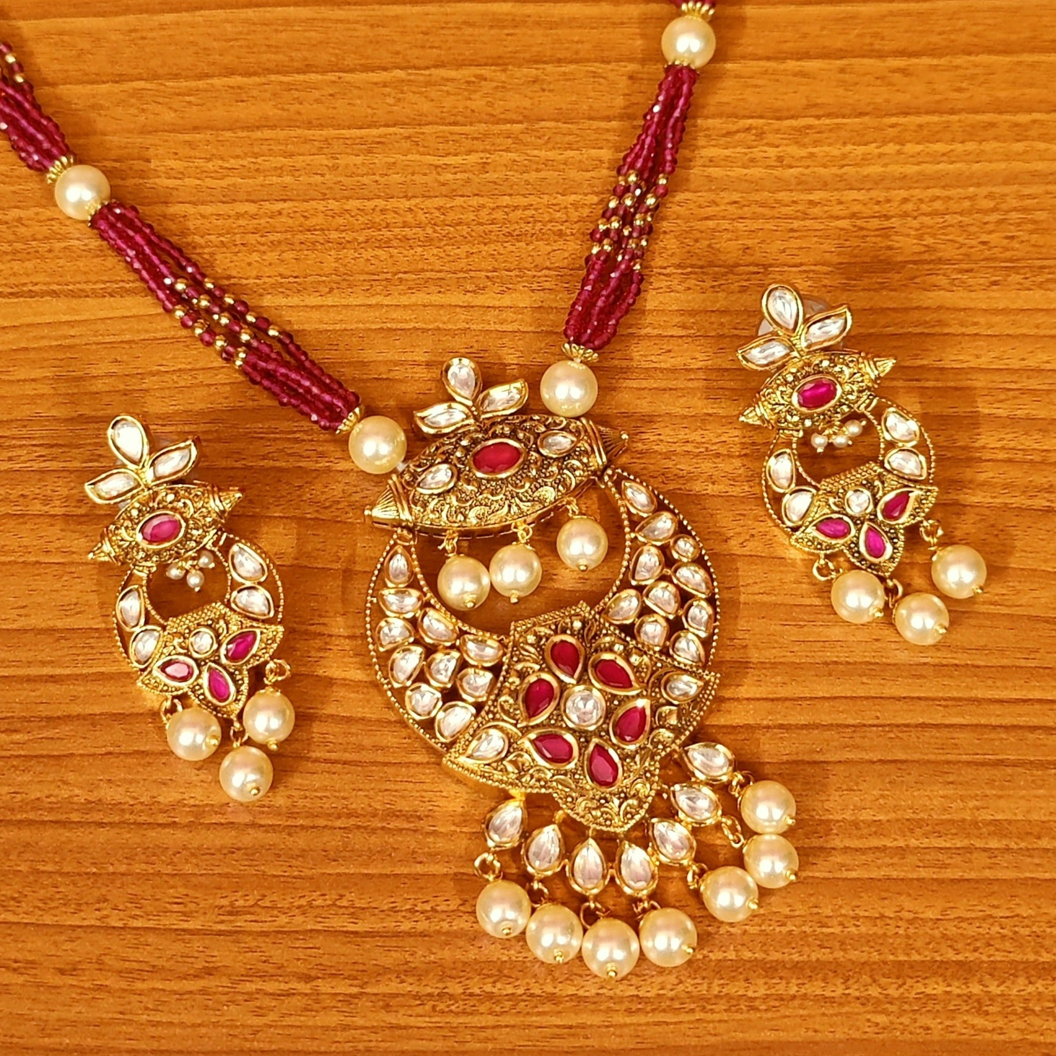 This handcrafted beautiful pendant set Is made in silver alloy with imitation emerald colour green stone & pearls and kundan polki stones of extremely fine quality. This gorgeous pendant set is handcrafted with fine engravings done with hand and is plated with antique 18kt nickle free gold rhodium that gives the design a real gold look . the pendant comes with a matching pair of earrings which are absolutely gorgeous and are very light in weight.