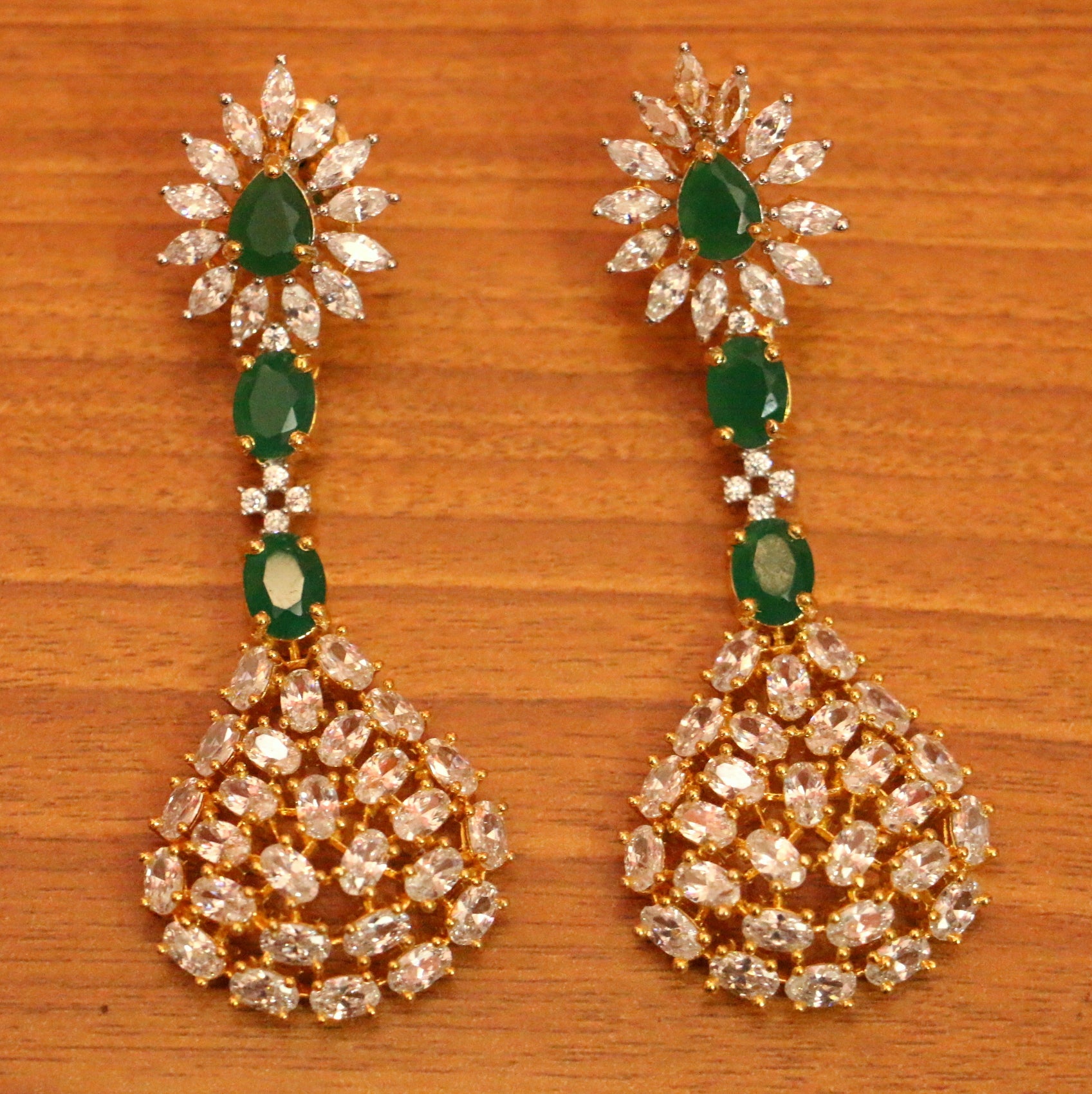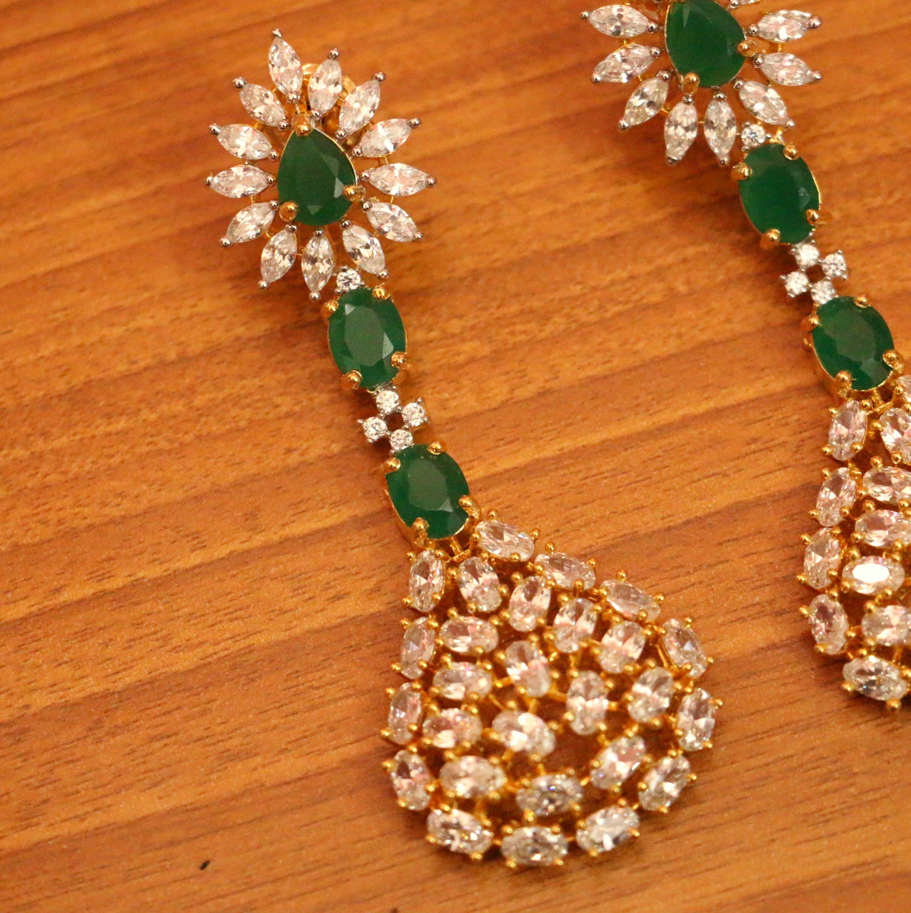 These earrings are handcrafted in silver alloy with imitation green emerald & american diamond work of very fine quality. These artistic yet modern earrings are plated with high quality 18kt gold rhodium. The earrings are very light in weight.