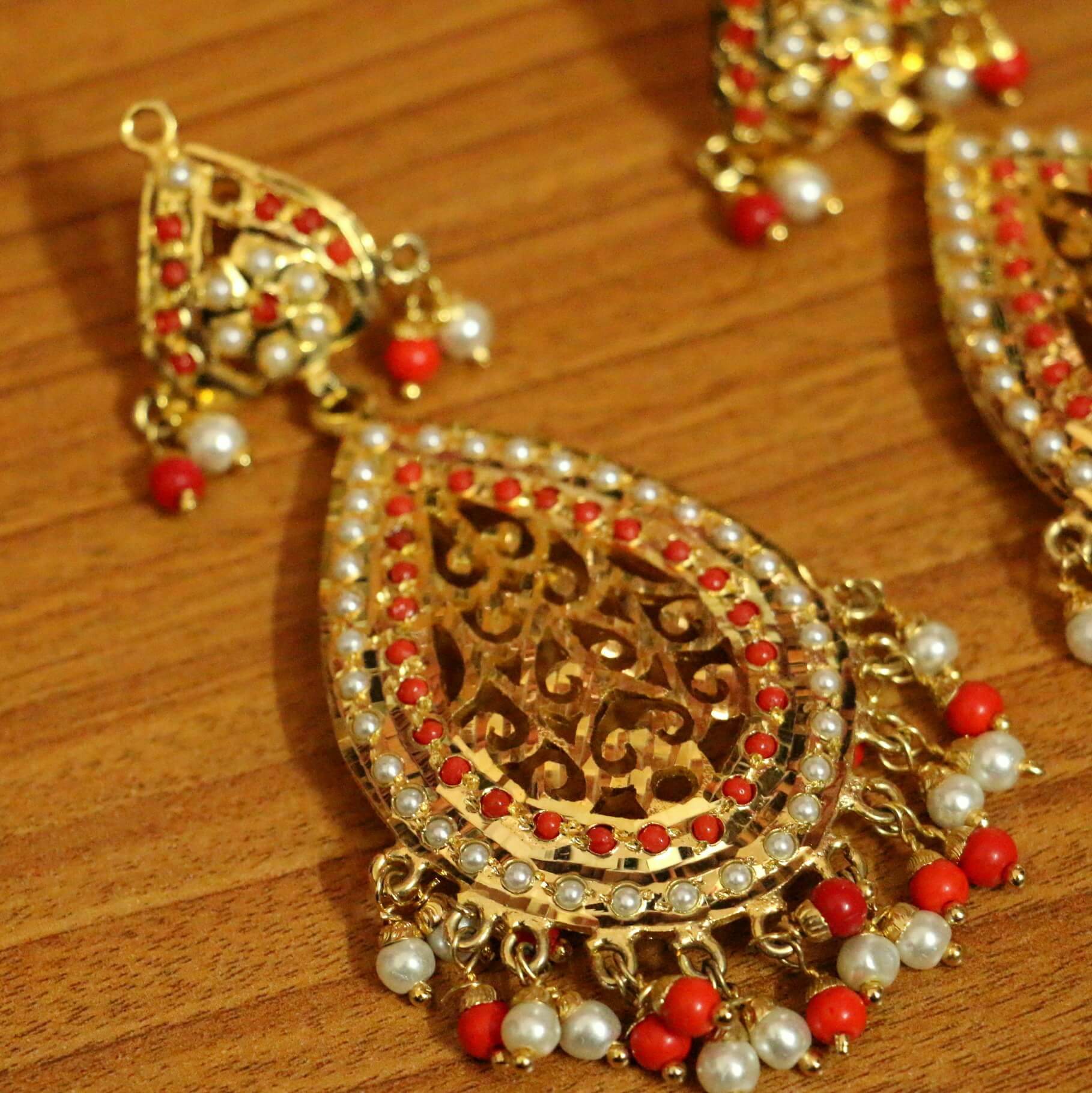 This Jadau look earring is handcrafted in brass alloy with imitation pearls and orange stones of very fine quality. These earrings are very light in weight and are coated with 18kt gold polish which gives you a complete new look .