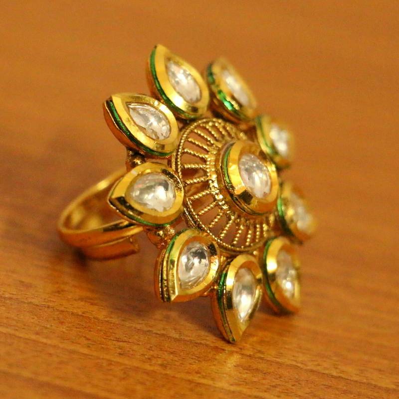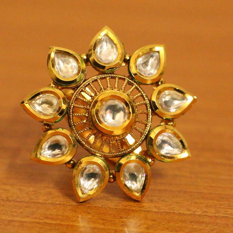 This beautiful ring is handcrafted in brass alloy with imitation kundan work of very fine quality . This ring is coated with 18 kt gold polish which give them a unique look . An absolutely stunning piece to own and are very light in weight.