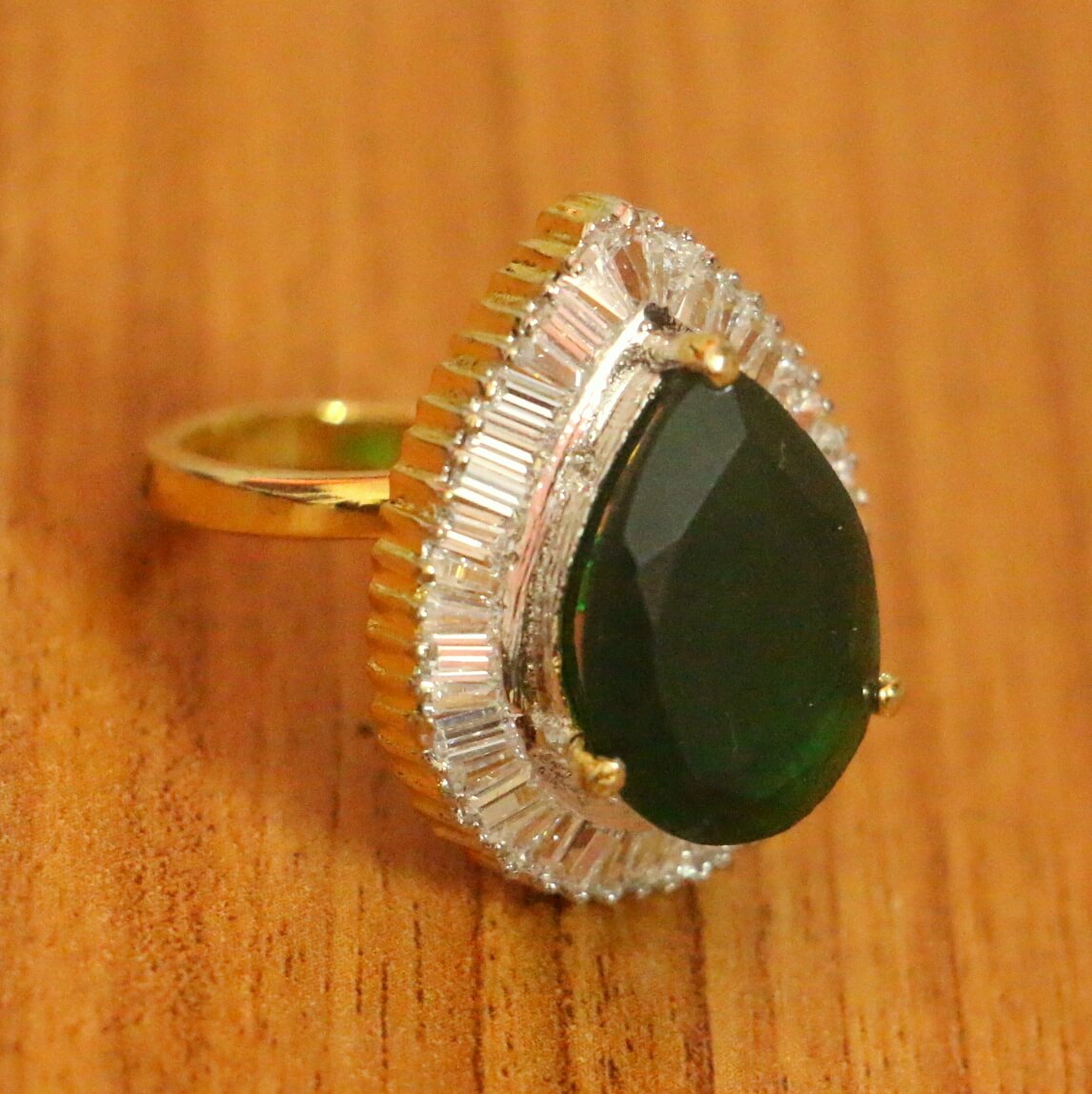 This beautiful ring is handcrafted in brass alloy with imitation green onyx & american diamond work of very fine quality . This ring is coated with 18 kt gold polish which give them a unique look . An absolutely stunning piece to own and are very light in weight.