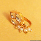 This kundan nose ring is handcrafted in silver alloy with imitation pearl and kundan polki stones of very fine quality . This nose ring is coated with fine gold rhodium plating which gives it a real look . The design itself is very unique and a perfect party wear.